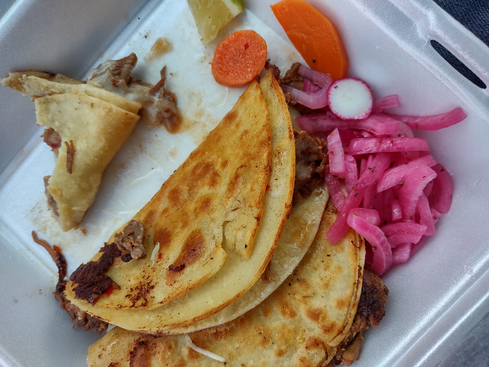 Read moreVery over priced for underwhelming execution... The quesabirria tacos were $17 for three regular sized tacos. no drink included the meat was bland and the tortillas were not fried in birria stock like you would expect. Also I asked for extra limes and the lady told me they were in the box and I had one tiny wedge of lime barely the size of a quarter. To say the least I feel overall disrespected and robbed...