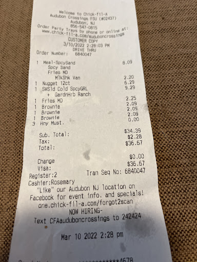 Read moreBEWARE, ALL CUSTOMERS, DRIVE-THRU OR DINE- IN: MY HARD-EARNED CASH WAS NOT ACCEPTED!!! SIMPLY BECAUSE MY BANK TELLER GAVE ME DENOMINATIONS OF $50 BILLS- ONLY $20 BILLS OR LOWER ARE ACCEPTED AND "YOUR CARD". THIS IS THE AMERICA WE LIVE IN!!! WHERE YOU ARE DENIED FOOD BECAUSE REAL MONEY IS NO LONGER ACCEPTED AS LEGAL TENDER, THOUGH ALL MY $50 BILLS SAY "FOR LEGAL TENDER" AND "IN GOD WE TRUST"!!! THIS NATION HAS SUNK TO AN ALL-TIME LOW WHILE THE VALUE OF THE "DOLLAR" IS DIMINISHING AND IT'S POOR ACTORS LIKE THIS WHO FOLLOW ALONG AND LOWER THE VALUE OF ACTUAL, PHYSICAL MONEY!!! MY KIDS HAD A HALF DAY TODAY AND I WANTED TO TREAT THEM SINCE THEY WERE HUNGRY AND THEY LOVE(D) CHICK-FIL-A. WELL, SHAME ON YOU, @CHICKFILA!!! I TOLD YOUR CASHIER I HAVE NO OTHER WAY TO PAY FOR OUR ORDER (STILL REELING FROM SHOCK!) AND THEY'LL HAVE TO CANCEL MY ORDER AND TO "TELL THEM (WHOEVER MADE THIS RIDICULOUS, UN-AMERICAN DECISION) I'LL NEVER BE COMING BACK"! SO CONGRATULATIONS, @CHICKFILA, MY KIDS WERE FORCED TO CHOOSE ANOTHER PLACE FOR FOOD, SO @WaWa "WAWA" TOOK MY HARD- EARNED CASH- 'WITH A SMILE', THAT SAME $50 BILL THAT YOU 'REJECTED', AND I HAD CHANGE BACK!!! SO WHILE I WAS GOING TO TREAT MY KIDS TO @CHICKFILA TODAY, FOR AN OVER $50 LUNCH ORDER- MY HARD- EARNED CASH WENT ELSEWHERE TO FEED MY KIDS AND YOU LOST "LEGITIMATE MONEY, LEGAL TENDER, FRESH FROM THE BANK TELLER"! SO SHAME ON YOU- YOU'VE SOLD OUT TO YOUR CASHLESS SOCIETY BUNCH! AGAIN, @CHICKFILA, I WILL NEVER, NEVER...