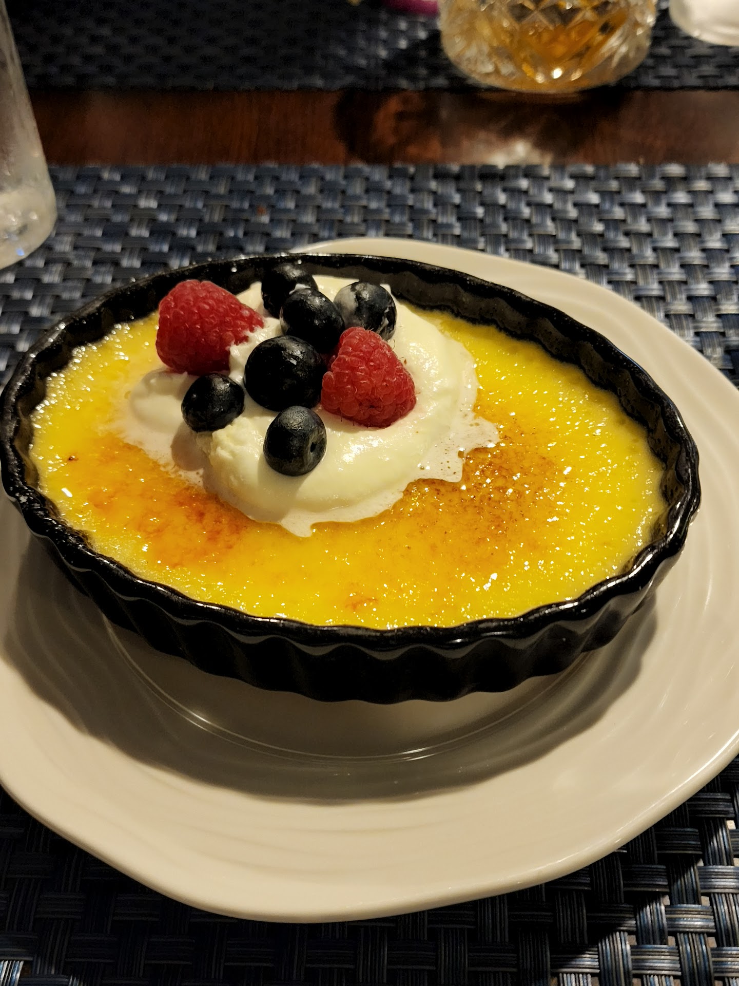 After we finished our entrées, we ordered dessert through the trainee. I unfortunately misspoke and asked for the cheesecake instead of the creme brulee. I would've eaten the cheesecake but I am allergic to pecans. When I brought this to our server's attention he seemed very annoyed but had the trainee bring out the creme brulee anyway. The dish that yhe creme brulee came served in was rather shallow. Tje top was barely brown so I was surprised to find that the bit of custard underneath the sugar was partially liquid. We also ordered the raspberry macaroon for dessert. The shell was rather tough meaning it was either overbaked or was no longer fresh. Overall we didn't feel as if the quality of the food matched the price we paid for it. We've had better food that was slightly less expensive at restaurants very similar to this one. We probably won't be...