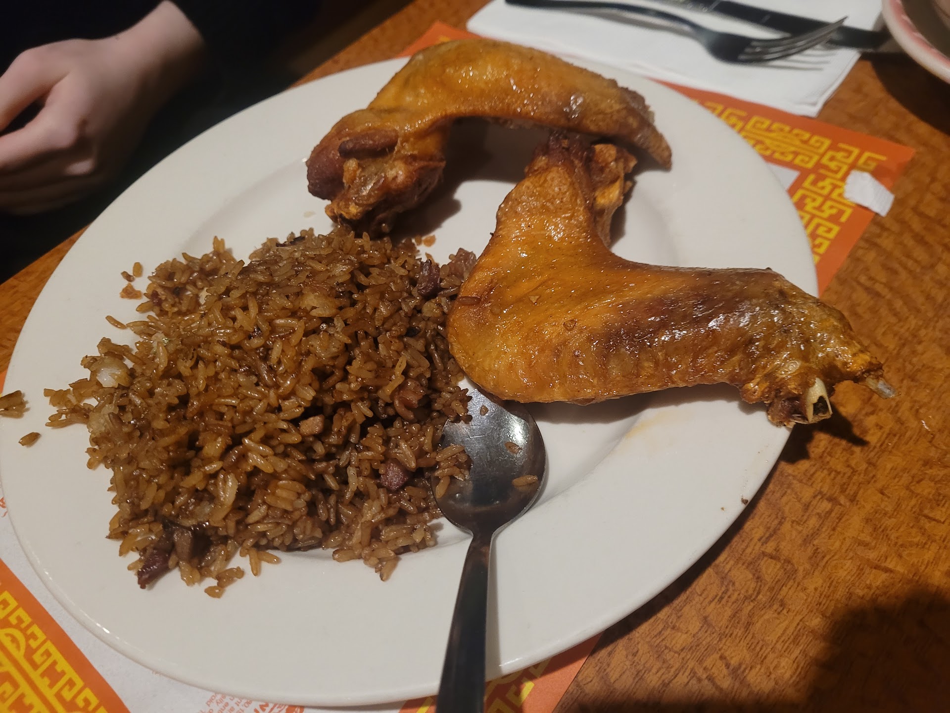 The chicken looked unappetizing (see pic), but tasted alright. The pork lo mein and pork rice were dry. The egg rolls and duck sauce taste like Christmas (all spice). Get takeout, or just don't go.