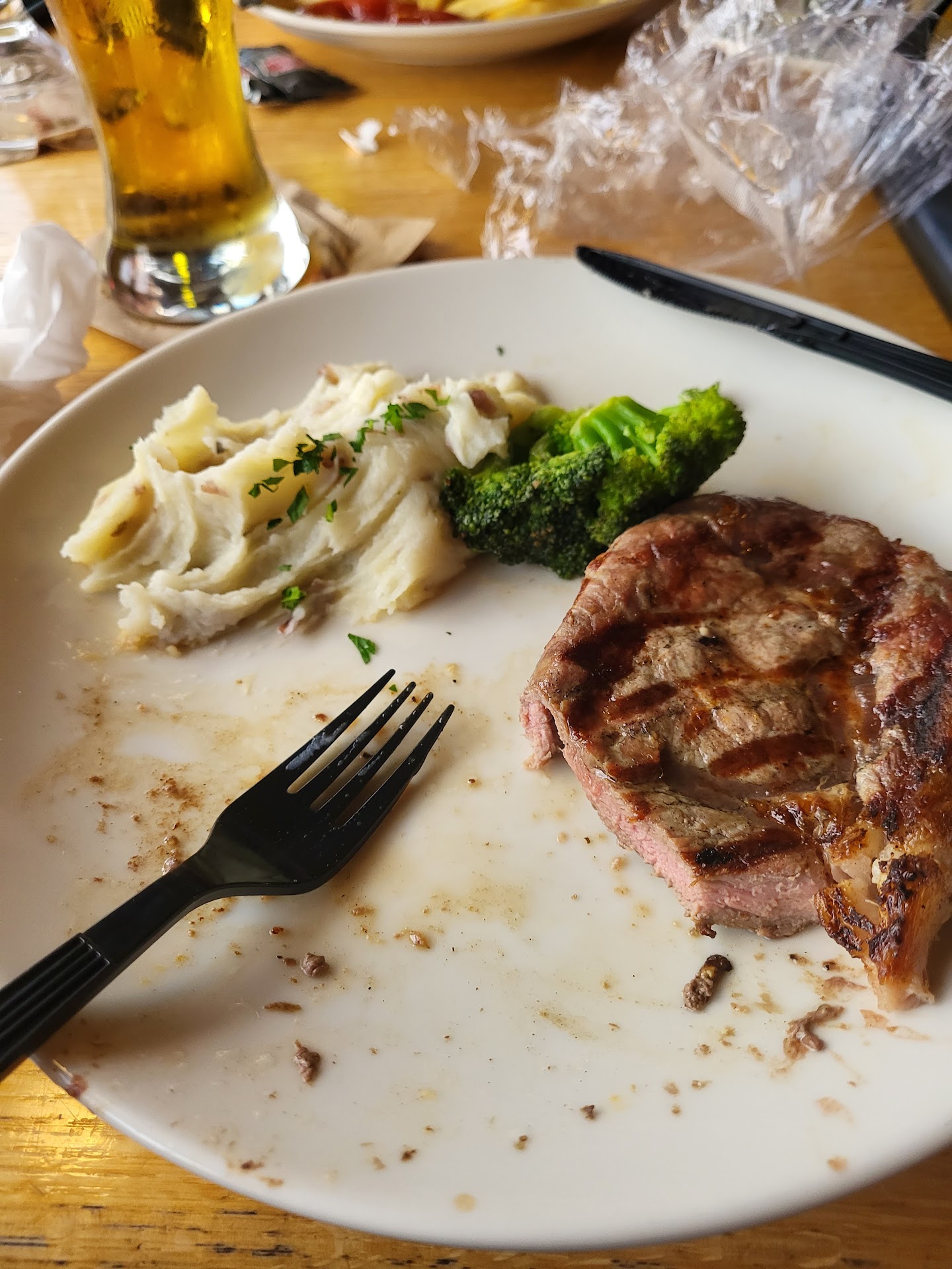 My fiancé’s riblets came out and were tough as nails and he couldn’t get the meat off the bone despite many attempts to. So naturally we waited for our waitress to come back and eventually she mosyed back over to us and we told her everything.