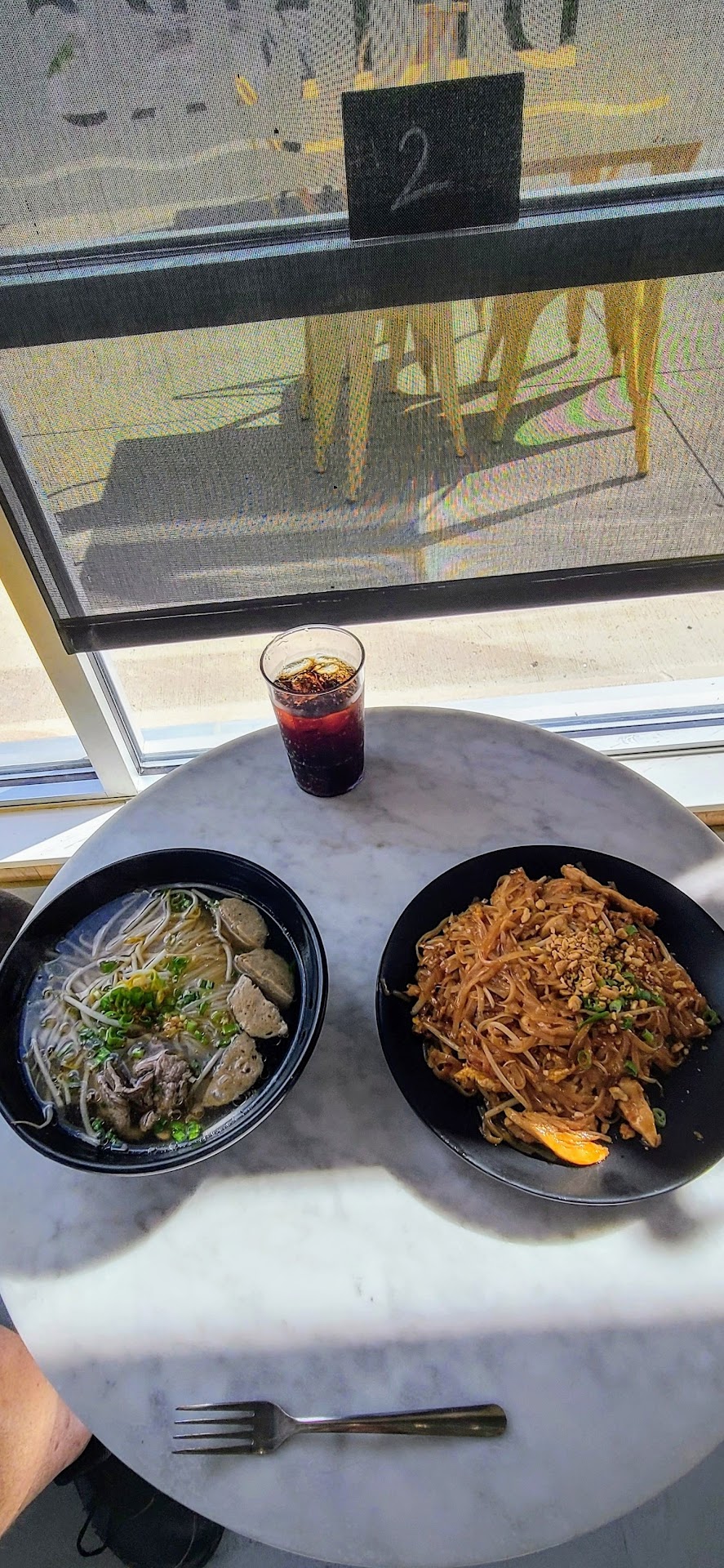 We had spicy (level five spice) pad thai. Not as spicy as you would think but spicy enough and very filling. I also ordered a soup bowl that had meatballs and steak in it, I only could eat a little, had to bring it home. Like I said, pretty big portion sizes they give you. The fountain soda wasn't flat tasting and it was crispy, unlike most fountain soda so I was pleasantly pleased tasting actual good soda. I have no complaints about any of the food, food was very good and I left completely full. The staff didn't seem the happiest but I'm there to eat not socialize so to me that didn't really faze me. I've seen bad reviews about this place, but for me it was a good experience. My only complaint was there was no ac. I was sweating to death, but that's not a make or break deal but on really hot days maybe a couple fans would be...