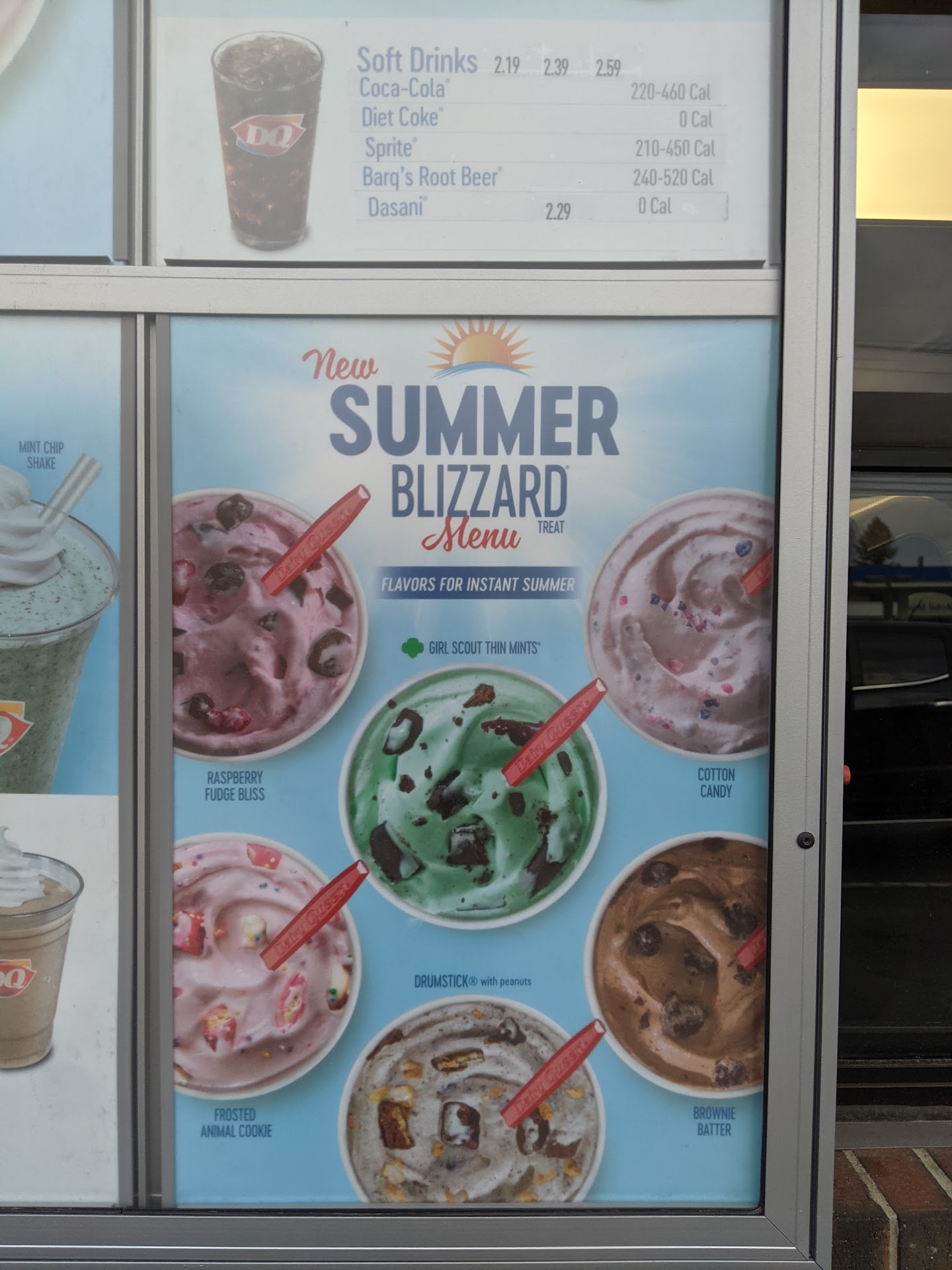 Read moreIt was an okay visit. Certainly nothing spectacular, out of the ordinary, or memorable. They were out of a lot of the simple ingredients (ice for example) and because of this, a lot of the menu was not available, or required substitutions. The two shakes were okay, not had, but certainly not above and beyond. 1 blizzard was ordered, And the (in my mind) crucial topping was forgotten or neglected. I preemptively ordered extra ingredients in anticipation of a sub par blizzard after receiving the shakes and was definitely glad I did, as even with"extra", there wasn't a whole lot. The staff was alright, but seemed a little lackadaisical. Not my worst DQ experience, but certainly not close to being in the list...