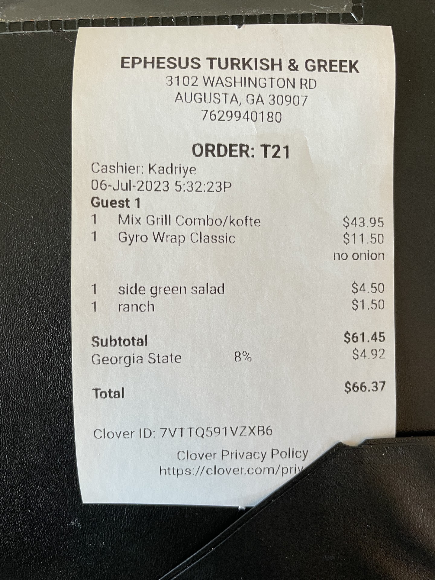 My son asked for a salad (instead of fries!) with his gyro wrap, and I knew he wouldn’t like the tzatziki sauce as a salad dressing. So I requested ranch instead. When we got the bill, they charged $1.50 for ranch for his salad. Perhaps their side salad doesn’t include a dressing, but that was not explained. Nor did we ask, so I paid the bill.