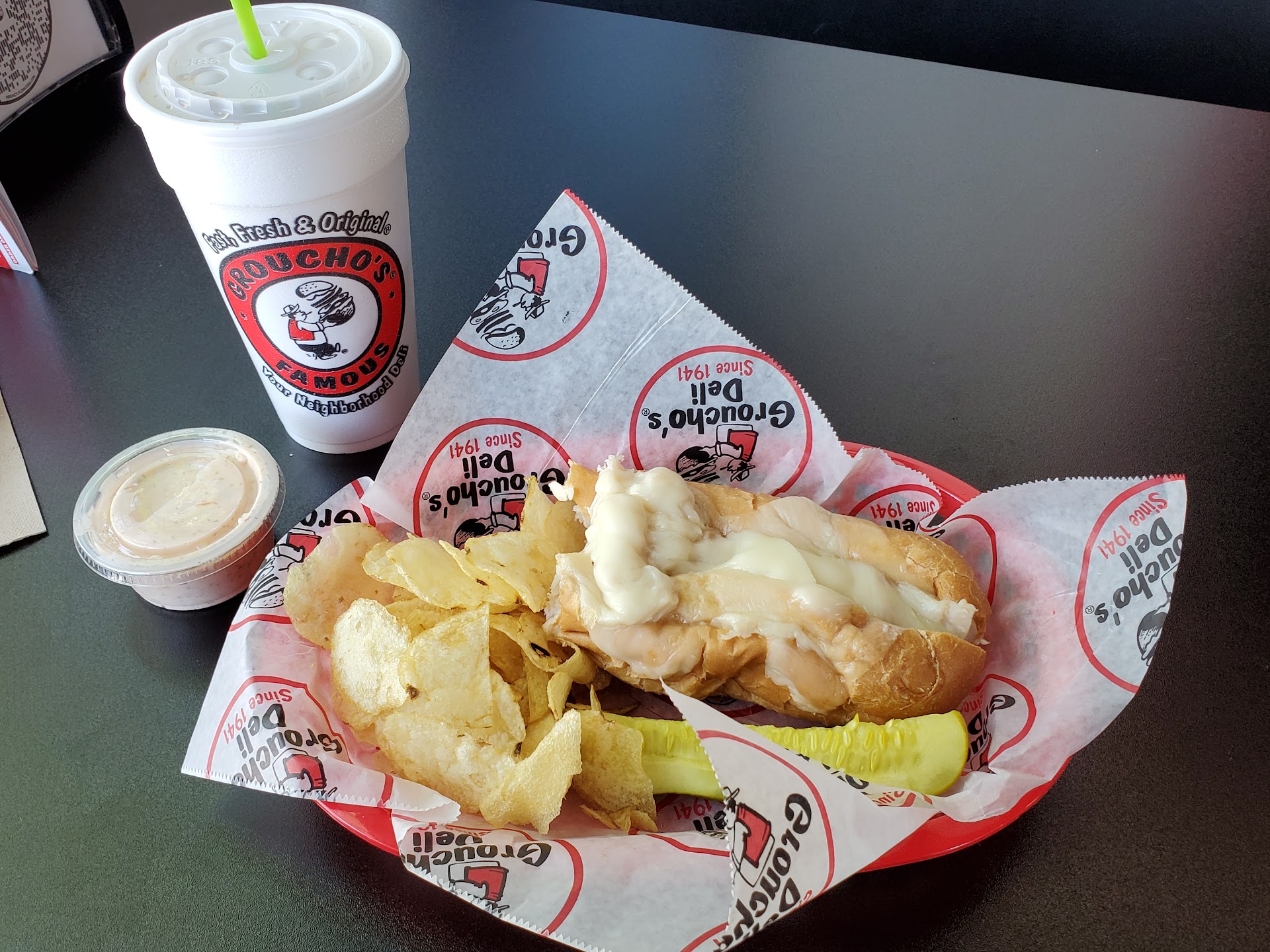 This is the first time we've been to a Groucho's so we didn't know what to expect. The place is very clean and spacious, which sometimes makes the sound echo. Hard surfaces cause sound to echo in the room. The menu has a large variety of hot sandwiches, deli cold cut stuff and salads and desserts. We ordered the Apollo Dipper with formula 45 (which is this thousand island mixed sauce concoction which happened to be the best part of the meal), and a rueben variation. The Apollo Dipper was essentially a basic sub roll (thankfully soft and like a Cuban bread without the crust) filled with turkey and ham and topped with Swiss. It was pretty unimpressive on its own but with the formula 45 it really tasted great. The chips that came with the meal were also surprisingly bland but were saved with the addition of the sauce. The Rueben was ok, but the roast beef was overly peppered/seasoned, and they topped it with a large amount of yellow mustard which made it taste very powerful. Our waitress was attentive and nice, and the service was good. Price wise, you can expect to pay around 8 dollars for most sandwiches, but keep in mind they do charge you for stuff like extra sauces and even has a 25 cent surcharge for water (no free water here). I would probably come back to try more of their menu since they have a large...