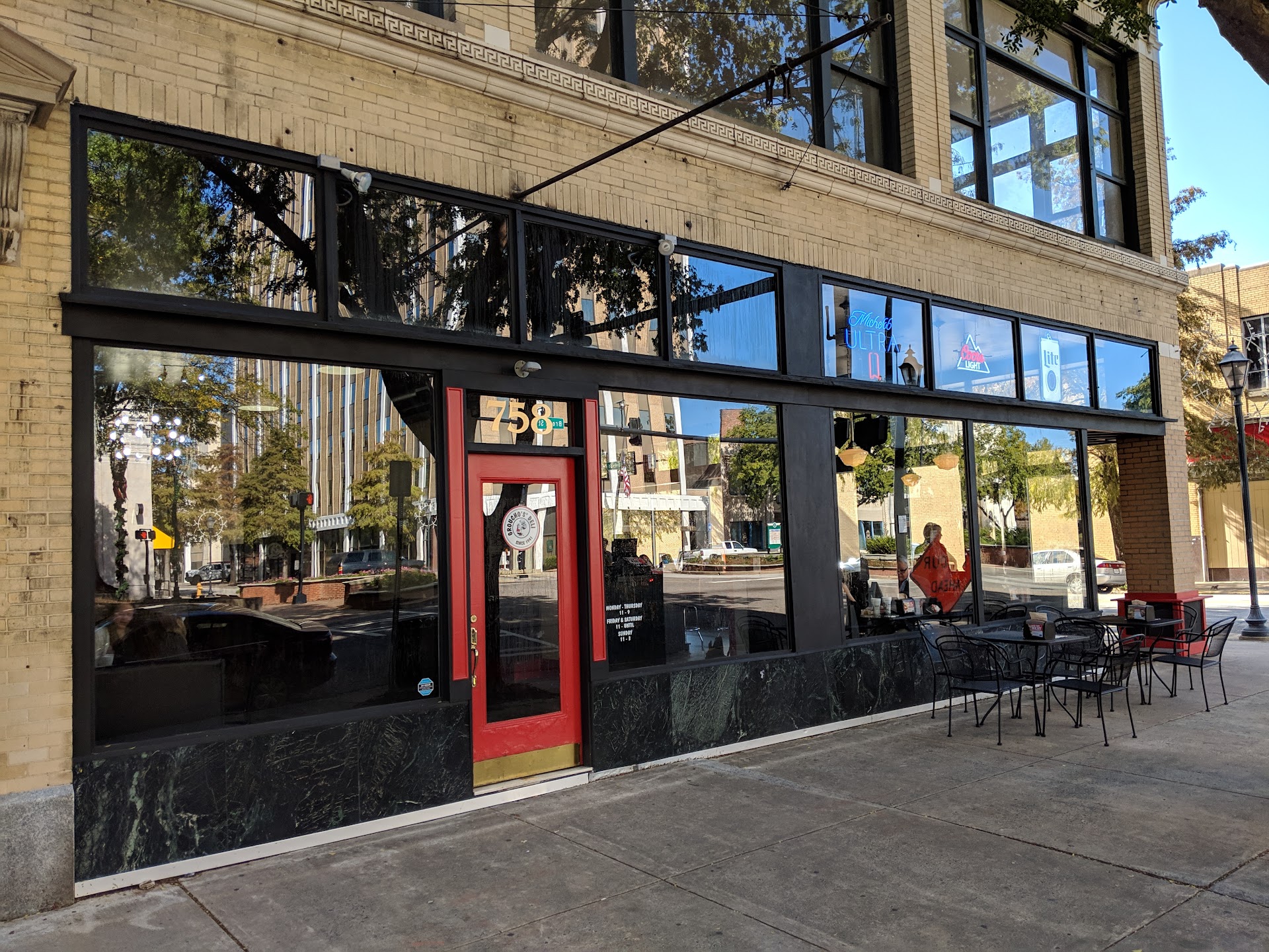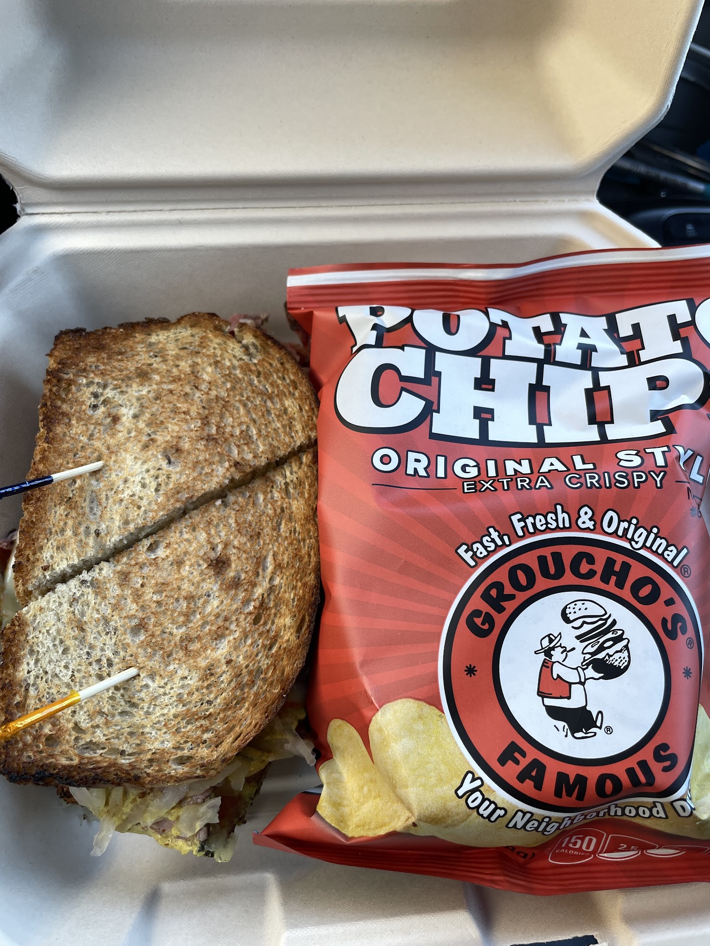 Read moreGroucho’s is a regional chain which began business in Columbia, SC by Groucho Miller in 1941. I’m sure it’s gone through many changes since. We were there for lunch yesterday, Saturday. The wait staff was small but attentive and efficient. My wife and I ordered a pastrami sandwich with potato soup and the mushroom and cheese wrap. Our friends ordered the international turkey sandwich and the Reuben sandwich. Our friends enjoyed their sandwiches. My wife said her wrap was mostly cheese, a few mushrooms with little flavor. My pastrami was ok. Bland with not much mustard; smallish rye bread and portion controlled meat. As I paid the bill at the register the waitress asked me how everything was. I said you’re all attentive and nice. The sandwiches were portion controlled and a true deli stacks the meat high and is usually known for that. She responded I was the fourth person to make that comment. The drinkers may like the fact you can get a beer with your sandwich. Groucho’s also has their own brand of bagged potato chips. Again, just ok; nothing to rave about. Our meal was pleasant. I’d rate this an average deli not to be measured to the standards of Hildebrandt’s or Sunshine Bakery locally or any of the other regional delis. It...