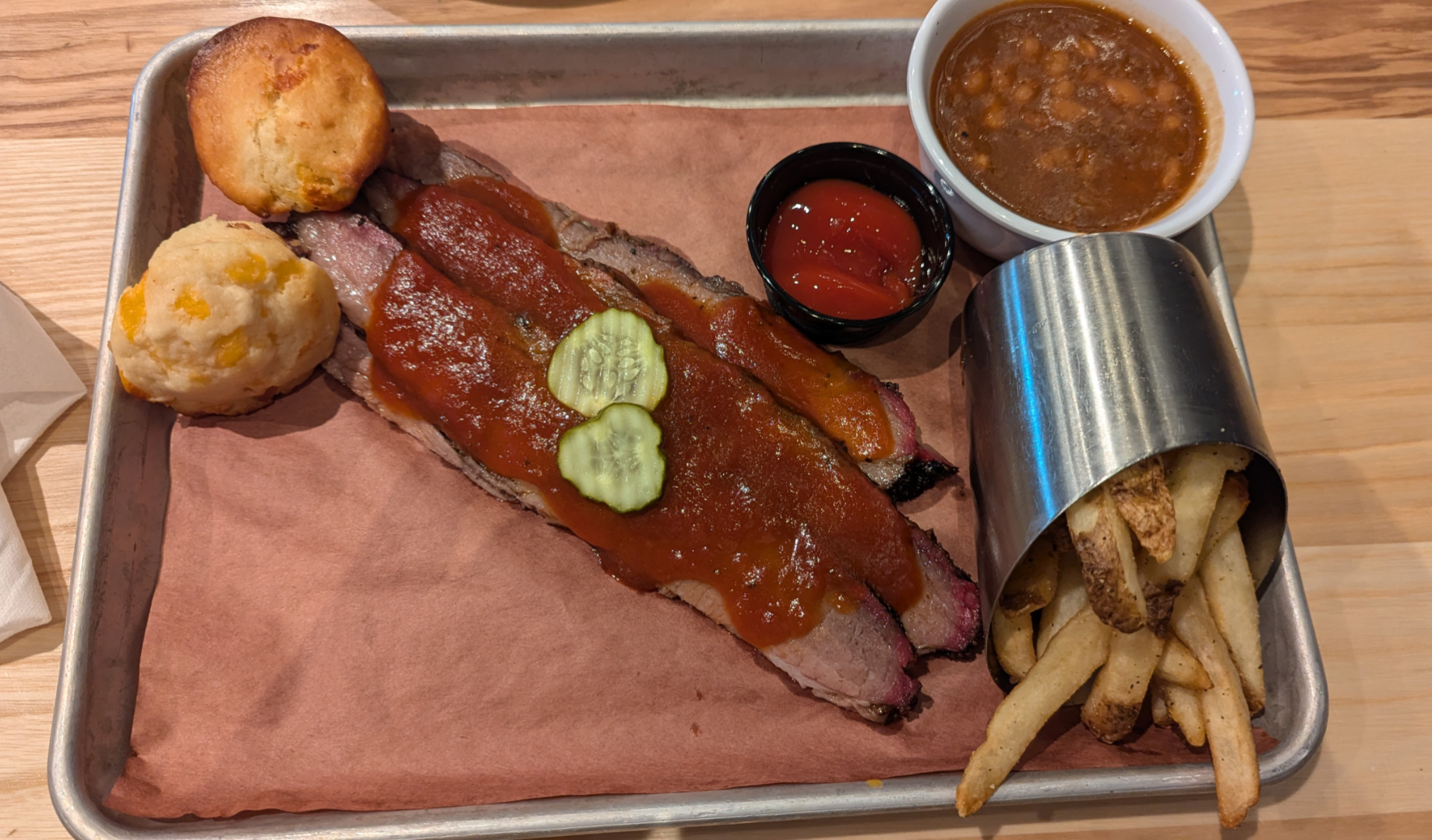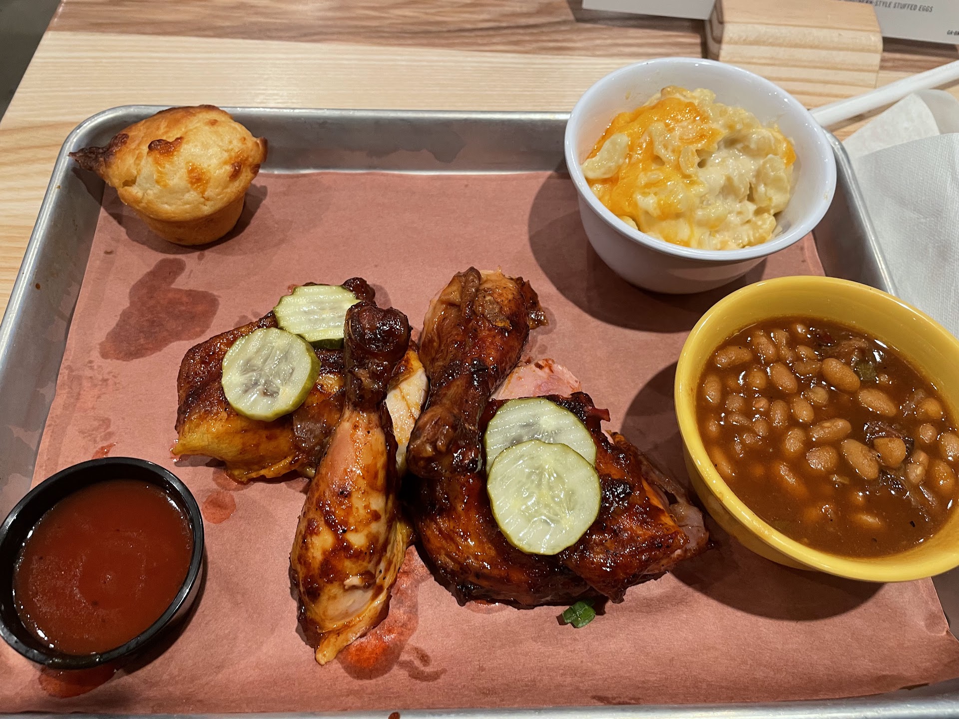 Once we got to the front of the line to order the first four items we asked for were sold out (chicken wings, potato wedges, Carolina pulled pork, regular pulled pork). This immediately was a disappointment considering it's a BBQ restaurant, how could you possibly have run out of pork by 6pm. We ended up getting two combo plates one with chicken and brisket the other with turkey and ribs.