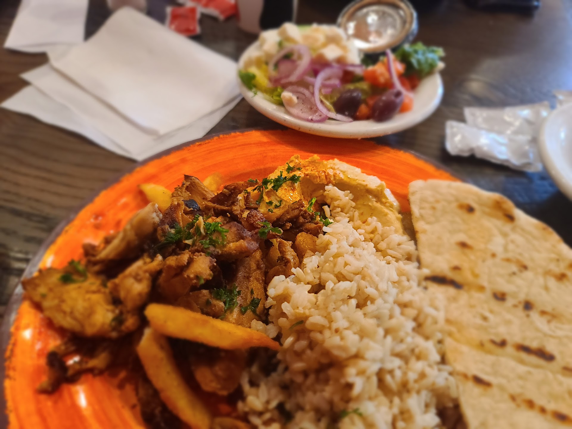 The platter came with rice that was meh, basic pita, a couple of sauces that were not bad but were unidentifiable. One was supposed to be tzatziki. They were both white with a bit of tang. One was too loose and the other was sort of like whipped butter but not greasy. The side was mixed vegetables that were mostly eggplant with some feta on top.