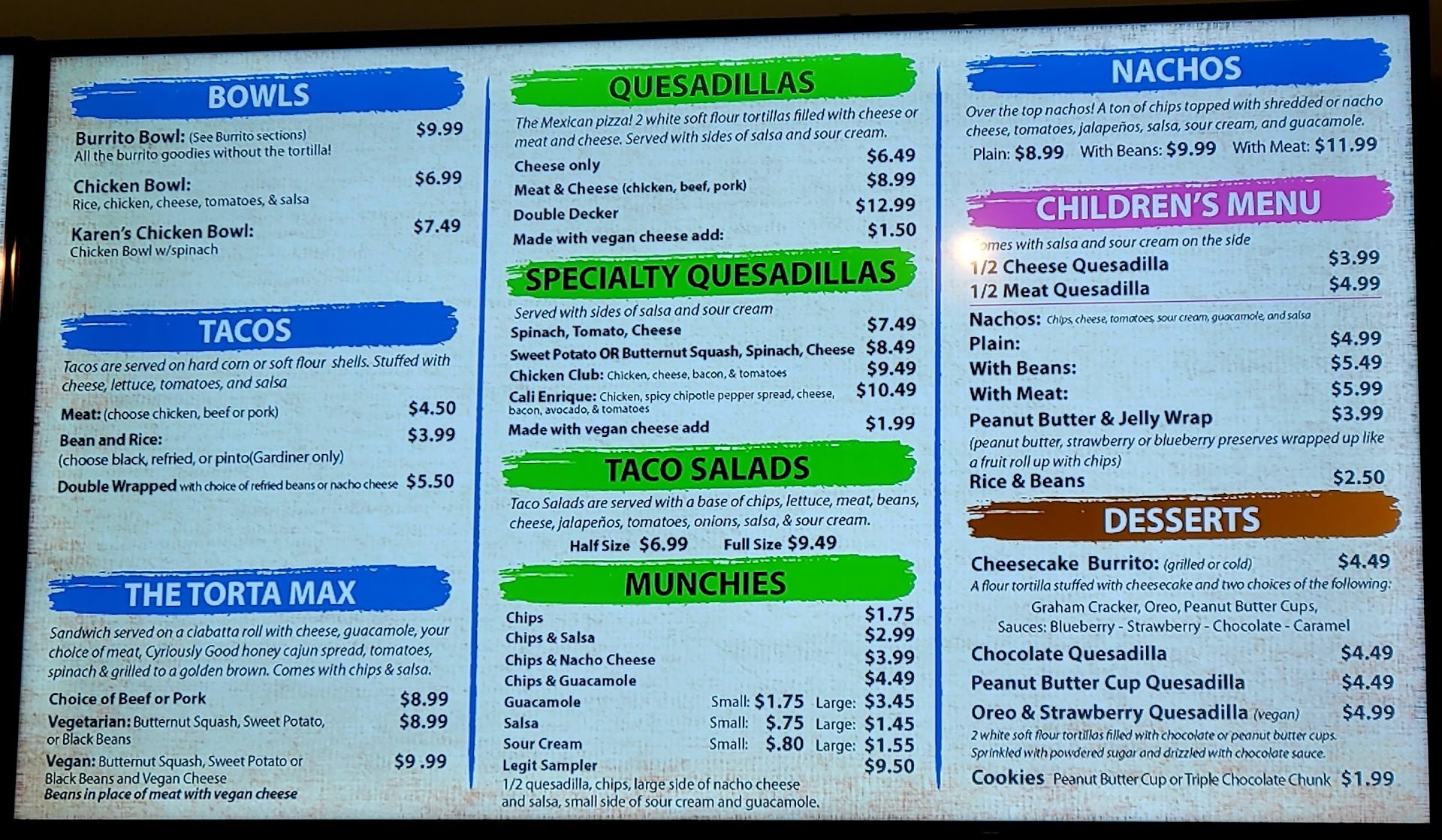 Read moreSo I must say I was very excited about trying this place! We are from Florida and I can’t think of any burrito places. Plenty of Mexican restaurants but not burrito places. I was greeted immediately by a male employee! He was super awesome and offered complements as well! He gave some of his personal recommendations which was great being that I had never been there before. -LOVED LOVED LOVED the chicken and cheese quesadilla! Amazing! The cheese on top made it that much better. -The burrito was HUGE! I got the build you own legit size burrito. I was a little let down to see that the majority of that burrito was rice. Definitely needed more chicken for sure because the rice over powered almost everything. -Garlic habanero was great. Nice kick with garlic flavor was perfect. **Didn’t like that the older lady touched my food bare handed. I made sure to only eat the bottom 2 pieces of my quesadilla because of this and threw the other 2 pieces away-which sucked because the quesadilla was amazing. Especially during a pandemic...WEAR BOTH GLOVES. The lady was super nice but that was pretty gross. -the place was set up really good for social distancing which was awesome. -the cookies...hmmm HUGE! Amazing and huge is all I can say about them lol. Overall this place was pretty awesome. Had my burrito had more chicken and the lady had a glove on her ungloved hand it definitely would’ve been 5...