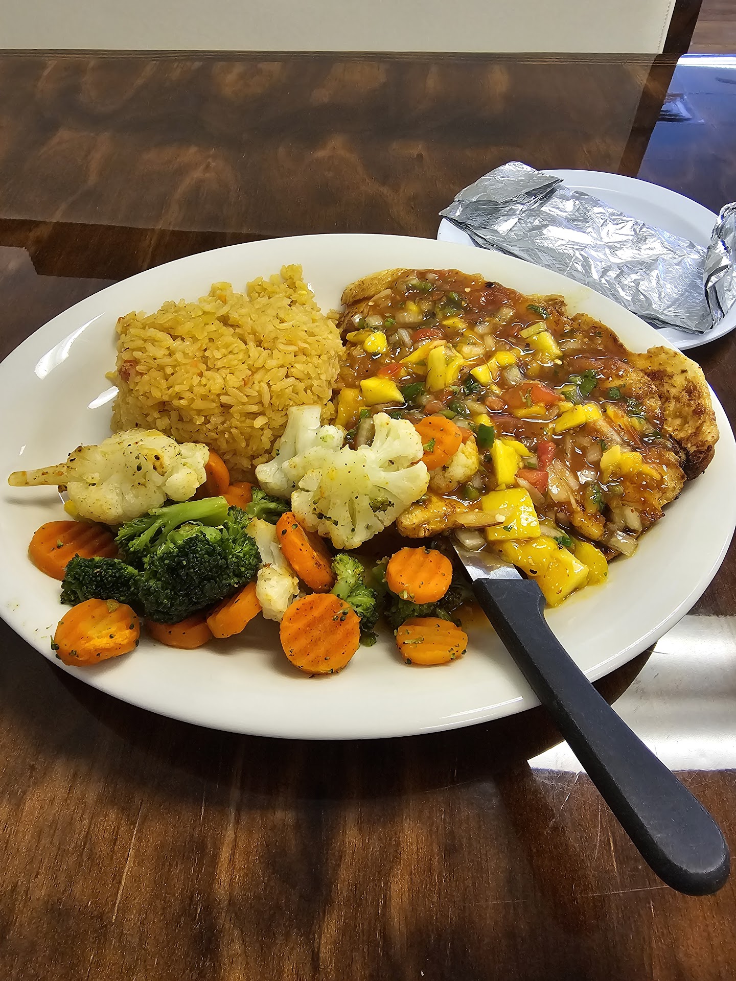 Read moreMango Habenaro Pollo was fantastic. Generous potion of marinated chicken covered in Mango Habenaro sauce. Rice was fluffy with a good flavor. The steamed veggies were tender yet still firm. Coke was well carbonated. Complimentary chips and salsa were also good. Festive music played. The place has been open about 5 months (I had to ask since everything looked brand new). It's well lit, open and airy. The staff were friendly, prompt, and attentive.