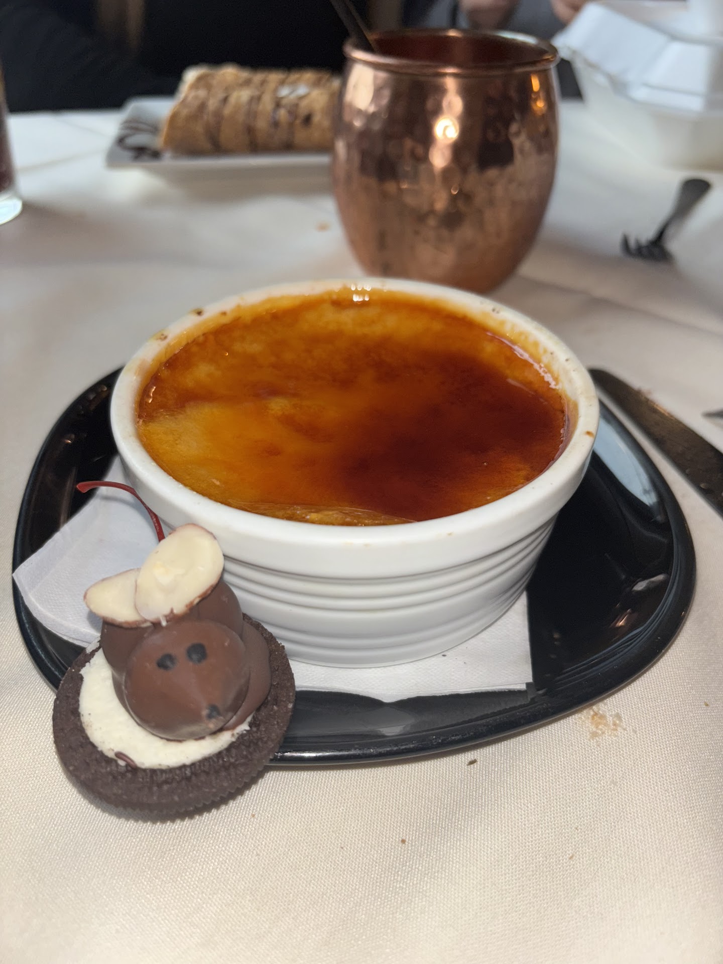 Fast forward to funeral day.. We arrived at the restaurant. The room that they gave us was perfect. The table was perfect. The view was perfect, the atmosphere was perfect. Even the artwork was perfect. I am firm believer that the devil is in the details. They have got it covered. Appetizers were perfect, the crab dip, bacon wrapped scallops, and homemade chips are to die for. The meals were great. Most had the haddock or scallop casserole which they raved about. Then we had dessert... My oh my. The creme brulee comes in flavors, vanilla, blueberry, mango... What!!!!!??-- speechless. On the dessert plates they placed the cutest little mice made from an oreo cookie, chocolate covered cherry and a hershey kiss. It rocked my granddaughter and nephew's world, the toothpicks in the Shirley temples or Roy Rogers were snow men. Adorable and thoughtful.