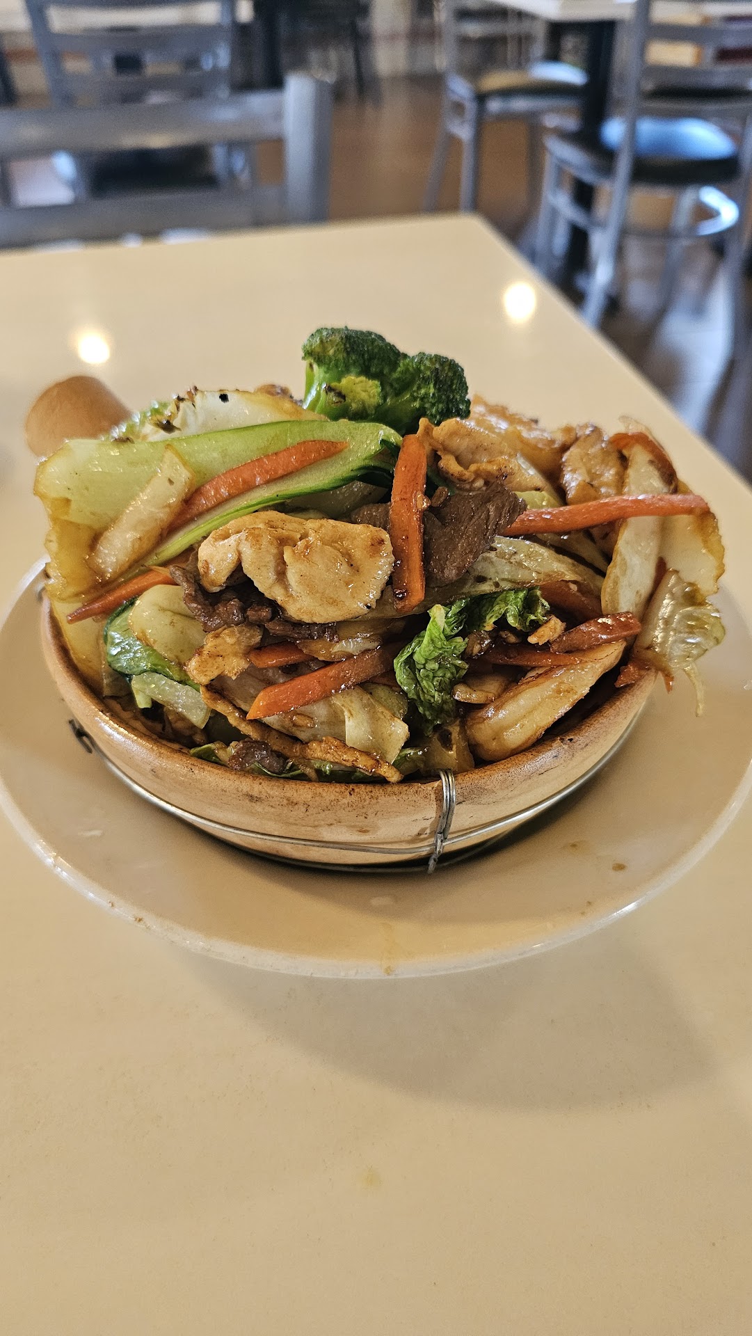 It comes in a small pot and some of the fried rice was crunchy and hard, which I didn't care for. This was probably due to the hot pot over cooking it. I guess I'm more of a plate guy than a pot guy anyway. I like access to all aspects of my dish at once. With the pot, you either eat your way to the rice (it'll be a while), or you must transfer the contents to another dish to get access.