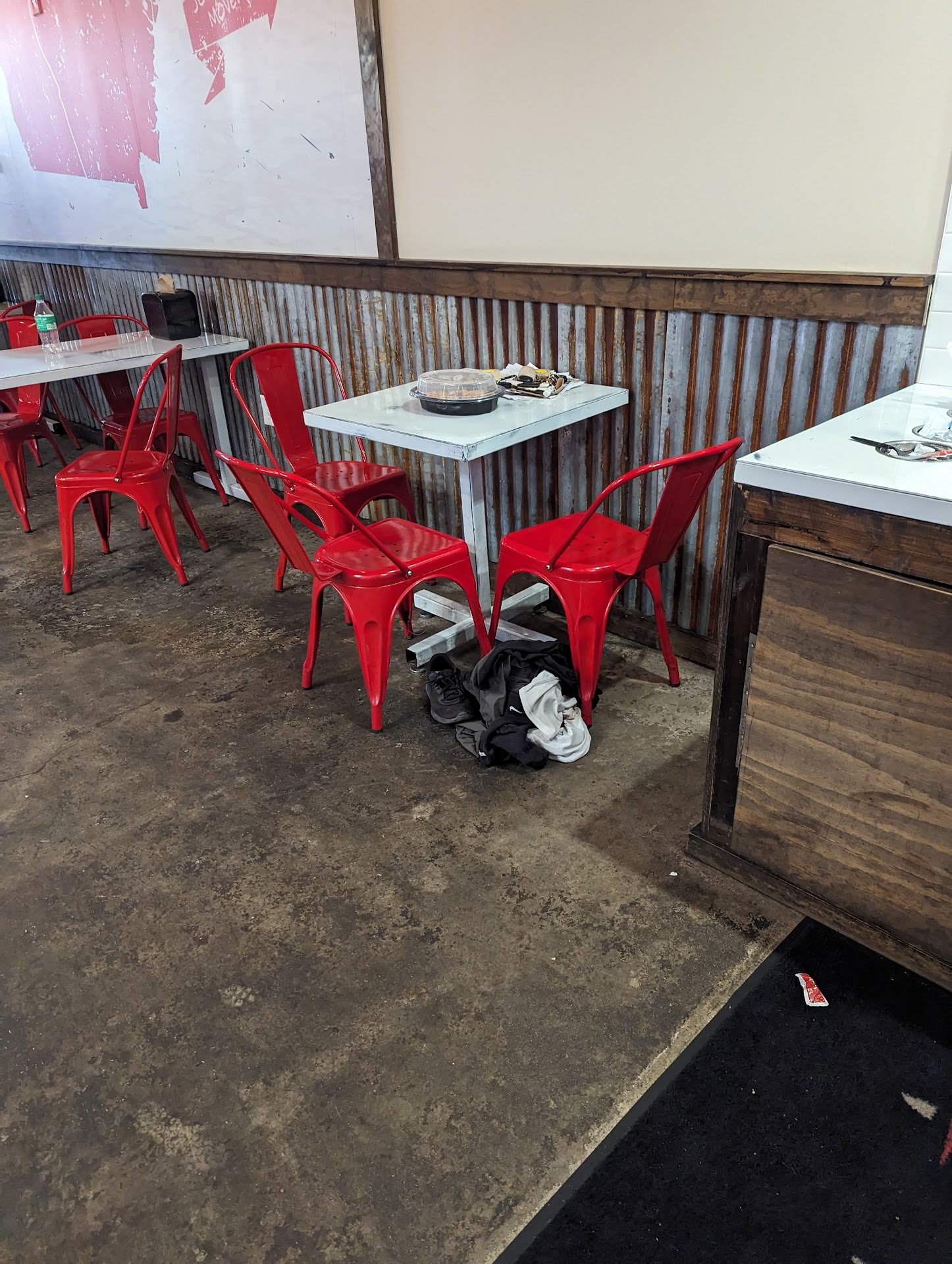 The bad: 3 months ago you received a review in which somebody pointed out all the flies, an open back door, and mess all over the table closest to the beverage machine. Your response was that you had pest control checking out the flies which was why the back door was open. You responded to the complaints about the messy table and said you would talk to your employees to clean up the employee table. You shouldn't have an employee table. If your employees need somewhere to put personal items you should provide them a space separate from the dining area. Otherwise you end up with the situation I got to experience today, which needless to say was memorable. Your employee table had various personal items on the top to include car keys and an uneaten tray of food, but what was especially memorable was the pile of clothes tossed on top of a pair of shoes on the floor in front of the table. The capstone of this pile was what appeared to be somebody's dirty underwear covered in flies. You know, the ones that you had pest control checking out 3 months ago? They were swarming all over the dirty underwear. I didn't get too close, but I'm pretty sure I saw skid marks.