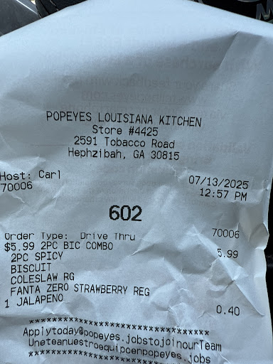 Read moreI used to get my Popeyes from the Deans Bridge location all the time, bc of where I used to live, and they got my order incorrect, or left out an item, EVERY single time. Tonight is my 4th time getting my food delivered from the Tobacco Rd. location, and I have not ONE single complaint. The first time I ordered from this location, I called the store and asked if they could make SURE my order was accurate. I didn’t get the gentleman’s name, but he was friendly, accommodating, and assured me that getting an incorrect order would no longer be an issue for me. He has kept his word so far! The food was fresh, order was correct, condiments and plastic wear were included, EVERY SINGLE TIME. The food was good, and the appearance was appealing. I know in fast food you can’t please everyone, and there will be instances where mistakes are made. But there is a difference between a “mistake” and just blatant disregard for what the patron requested.