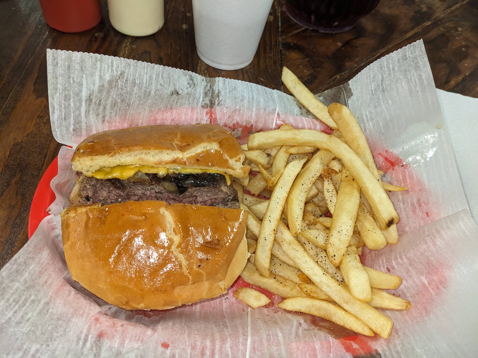 Ā Ā Ā Read moreWhile I have to admit the burger was really good, I have never waited an hour for 3 burger baskets at a moderate level of busy. We had to ask about our food after the 50 minute mark, the waitress wentand made it herself and came back to the table to tell us it had been ready and was sitting on the grill. She gave us the smallest amount of fries (maybe 5 full French fries in each basket) and told us she would bring more, she brought us one only partial full basket between 3 meals this would still not add up. The food might not have been that big a deal if it was all fresh and we hadnāt been waiting for an hour but with no compensation on the meal whatsoever the entire experience was not good.