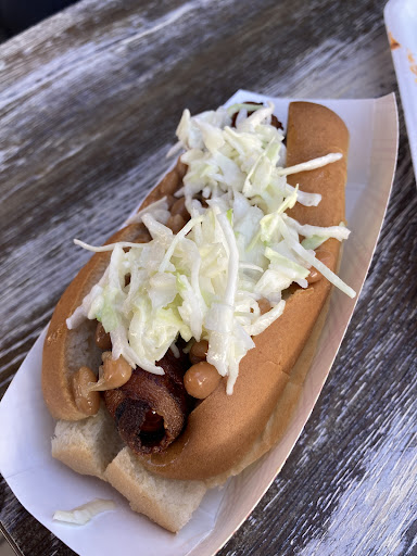 Today was the day! Arrived at 11am for some delicious dogs - my husband and I ordered the chili cheese fries, two dogs and a drink combo ($13). One dog had chili and cheese the other had baked beans, coleslaw with bacon... dang! That beanie dog was soooo scrumptious I had to have another! Who would have thought coleslaw and beans on a dog would be that good?! The staff are super friendly, great vibe! The place itself is like a black and red retro kind of feel to it - so the chairs are black metal and counter tops rustic. I liked it. It is January 2025 so it is winter and the place was nice and warm inside. I will have to go again when it is in the summer and see what the fuss is all about and check it out for myself.