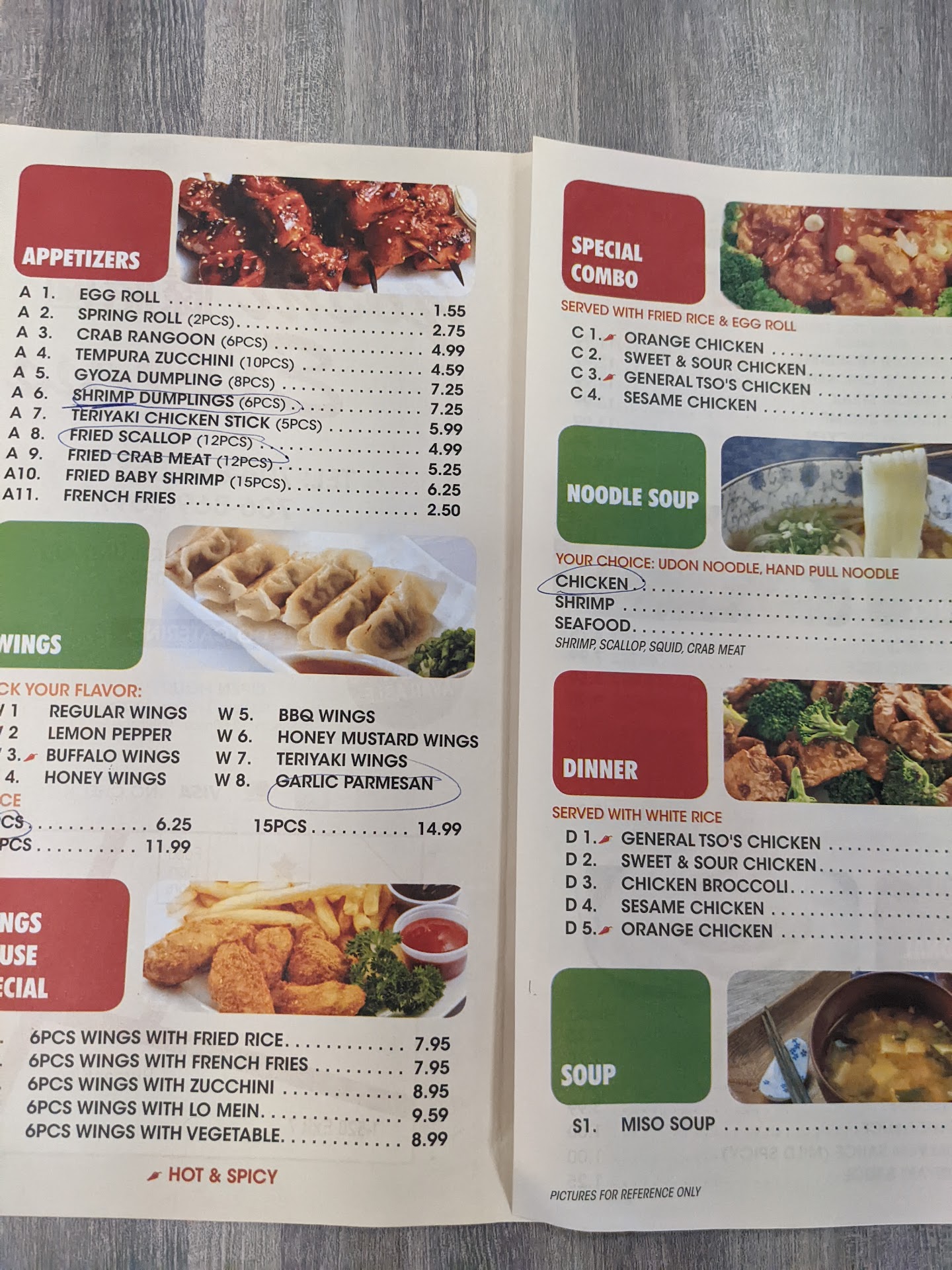 In the photos (named in the order in which I posted them): plain Chinese wings, shrimp noodle soup, teriyaki chicken meal/ fried rice veggies, beef lo main, fried crab Rangoon with red sauce, shrimp dumplings, more shrimp noodle soup, teriyaki chicken on stick, brown au jus for the shrimp noodle soup, pepper steak and onion, fried crab meat, and some...