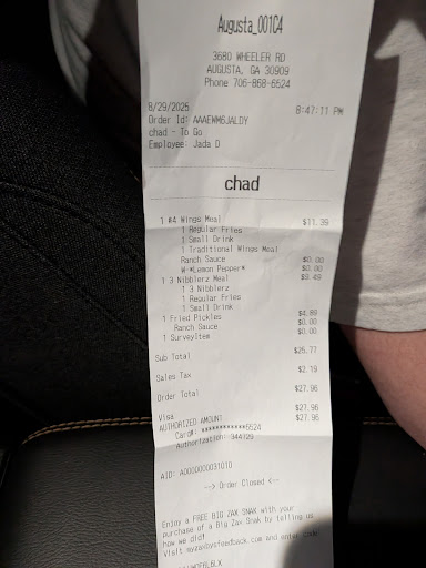 Read moreI went to this Zaxbys at 4:14 pm...I ordered 2 W/Things with the all flats...I got to the windows a young lady spoke an took my 17.26...Then then young guy comes from out didn't wash his hands and opens the window as says u had a large coke with a zax plate I said no he states Oh hold on...He passes my food out the chicken was so old look like it had been sitting all day so I ask could I get this fresh please..I sit at the window 10 mins he walks back an say can u pull up its gone take a while an we have a line behind u..I stated ok no problem..I look at my watch it 530 I walk inside they say we still cooking it for ikr no problem went back to my car...It's now 545 no food walkin in young lady ask for my receipt the guys need it to make your order...He pass the food up an it the same food I gave back...I ask to speak to a manager a lady came I explained to her I want fresh food I don't mind waiting she didn't take my food back she walks to the back with an attitude an get the chicken out the fry vats an fix the wings comes back an said here u are I said well ma'am all that time my fries an everything else it cols she states Oh I didn't know u wanted that fresh too...I'm like commen sense would say u don't want some hot some cold...She states Oh well u didn't say they was cold so another Manager comes up attitude what the problem why is she still here explain to him what was going on...He says ok we replace the chicken takes the boxes that had the first chicken out like I wanted free food or something I said I didn't come her for free food I came here to eat...The time now is 605...I ask to speak to somebody over both of them he came up front an he remembered me from the window explained it again he states what can I do ma'am im sorry he refunded me an gave me the food but mind u the guy manager was like I'll talk to u later...Whole point is I wasn't here for free food I was here to spend my hard earned money for something I like to eat...the manager are rude an have the nastiest attitudes..If all the manager that came out while I was having the issue was on the floor I might not have had the problem...I will never eat here again bc I don't have too I chose to no my little money might nor mean much to u but somebody else business will...