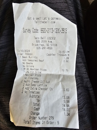 Read moreAbsolute dumpster fire of a taco bell. Was amazing when they first opened and the couple years that followed. However this past year has been an absolute mess. Went through the drive thru and ordered a couple tacos only to open the bag and find a tiny bit of meat and cheese rolled up into a cigar shaped taco lol. I went back and told them my order got messed up then politely asked if they could correct it. The guy working the window snapped at me and told me to prove it, so I presented the tacos. The cook who made it came over and looked at them then took off his hat and through it on the ground and walked away. The inside of the building was absolutely disgusting, trash all over the kitchen floor and lobby floor. The female manager said that I just ordered plain tacos not supreme tacos. I presented my recipe showing otherwise. The drive thru kid yelled something about $24 then slammed his hand on the counter. Then a very polite gentleman who was quite the entire time presented me with my food and apologized. I thanked him and left. He literally looked like a high school kid who hated being there but was very kind lol. Needless to say I will never return. Taco johns is better anyway. I only stopped there because I has just gone to the store and it was more convenient. Next time I'll just hit up tj's. Avoid this place. The food is typical, the portions are skimped, and the price isn't that much cheaper than any other place these days. Plus the inside is literally disgusting and very dirty. I feel like if more people saw how dirty it is kept they would avoid it...