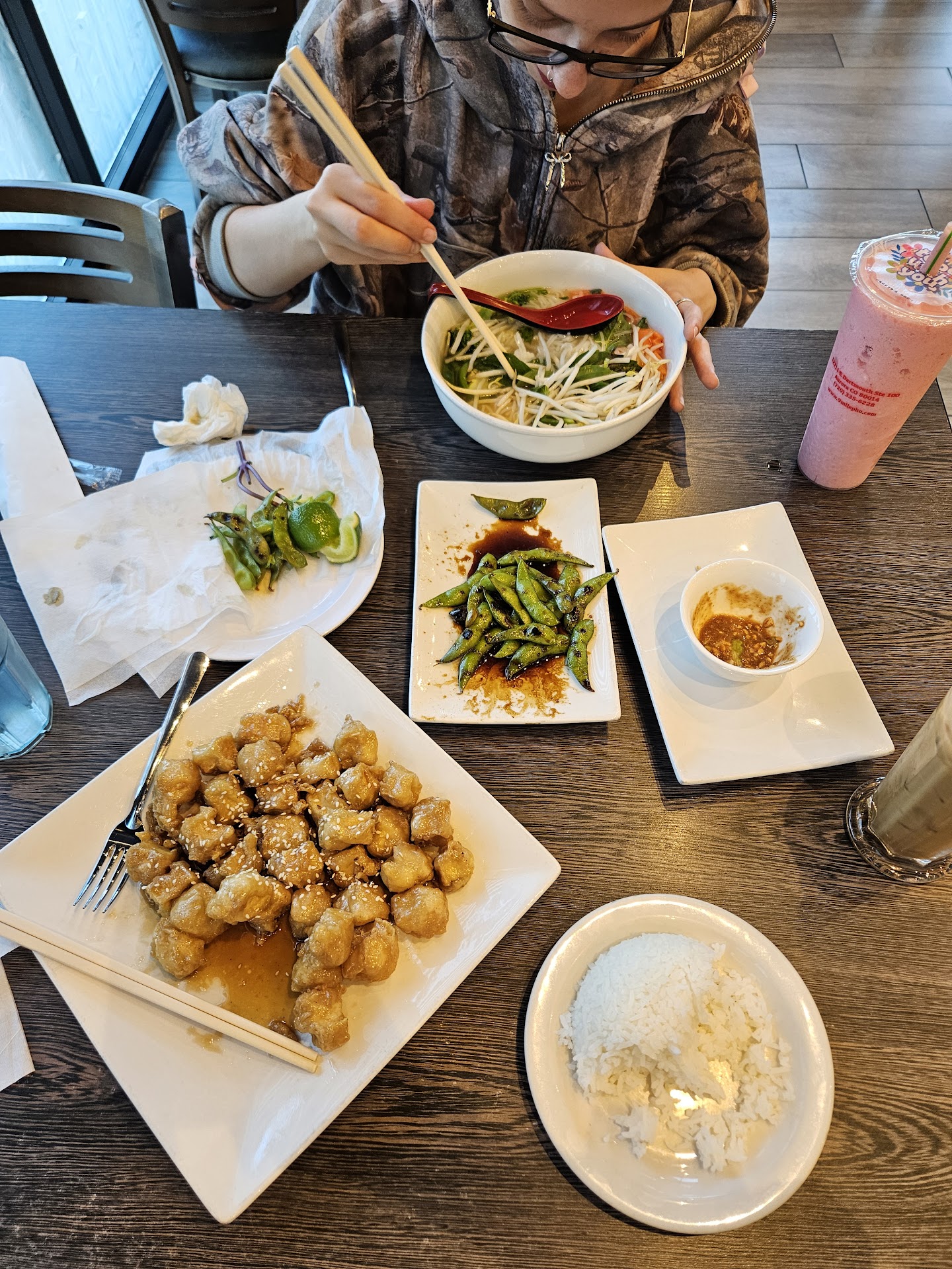 We had the absolute best meal here. The staff was so warm and inviting. We were greeted as soon as we walked in. We sat down and were brought menus and water very quickly and once we were ready to order, our food showed up quickly. It was exceedingly obvious that it was made fresh and brought out instantly once finished. I can not stress enough, just how good the food was. We started with the tofu spring rolls and edamame. Both were fresh and the dipping sauce for the spring rolls was delicious. The edamame though...... good grief! That was the absolute best my daughter and I have ever had. My daughter had the Shrimp Tom Yum Pho. She ordered a medium and was floored by how big it was. The ingredients were so fresh and bright and the shrimp were a really good size. She was given a plate of lime, sprouts, jalapeño and basil which were amazing with the Pho. This chick of mine, is obsessed with Pho and she said that this was top tier. I had the Sesame tofu and it was sooooooooo good. I've never in my life had tofu fried so crispy. Definitely not over fried but wow! It was intensely crispy and sweet with a luscious glaze. To drink, I had a Vietnamese coffee and my daughter had a strawberry slush. The slush was so fruity and refreshing and the coffee was rich and creamy. We both decided that, this is our favorite place to eat now. The prices are really good for the quality, freshness and expert recipes and cooking. I highly recommend this place. We got enough food for 2 meals each plus 2 appetizers...