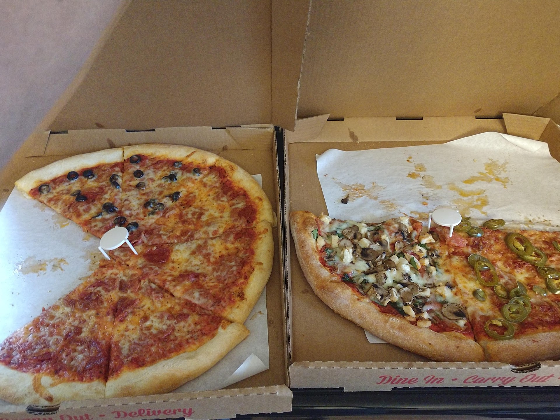 The box was obscenely heavy, and upon opening contained more pizza tables than I've ever received in my entire life in all the pizzas I've ever ordered. They were arranged in a grid to try to suspend the ceiling of the pizza box from the ocean of cheese below.