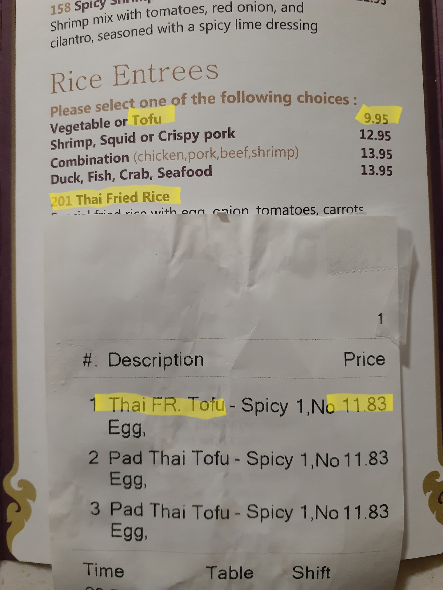 I loved this place, but not anymore. I wish I could take back the gratuity I left. I called in an order, the lady was kind but quick to end the call without taking my name or giving me an order total. I drove while it was snowing nonetheless, to grab this order bc the quality of their food is on point, they didn't seem busy, the wait time was a reasonable 15 minutes. But upon my arriving, the lady asks me what I ordered, of which I verified, & she continued to charge my order. I would think it would be more beneficial to ask a customer's name to verify orders to avoid mixups, but no harm done bc my order was there so I disregarded that. Though upon getting back to my car, I checked the menu bc what the receipt read was not what I expected (see photos). I was overcharged and went back in to ask why the prices were different than what the menu I had in hand stated. The lady who took my order just looked confused, & her along with the man who came, seemed to have no real explanation, they just kept looking at my receipt puzzled but saying it was right. Another woman who was at the register tried an explanation that made no real sense either while she went on to write new prices on my menu I had. I asked if the prices had changed & if I needed an updated menu or something, to which they scrambled to find another one (at which point I had already realized they were avoiding rectifying the issue). On another day I can promise I may not have been so nice, but I had no time to argue & slick roads on the way home, so I took the 'updated' menu they gave me in return for my "old" one & I left wishing them well. The 'updated' menu had even CHEAPER prices than the original I had, which further confirmed they just really didnt know what to do with my pointing out I was overcharged on all 3 items I ordered. Even the ONLINE menu reflects the prices I was expecting to originally pay, but yet I was charged more.. double frustrating even considering I omitted egg from every dish (which in my mind means less cost from an honest business standpoint, though honest business practices have been dwindling for some time). I was so impressed the first time my fiancé and I tried food here, but after this experience I can say that I definitely will NOT be back. I don't like when my money is taken advantage of, especially during times of financial hardship. I'm just gonna look at it like maybe they needed that extra money more than me, but it'll be the last of my patronage they receive. It's not hard to know what your products cost and confirm that is what your consumer is...
