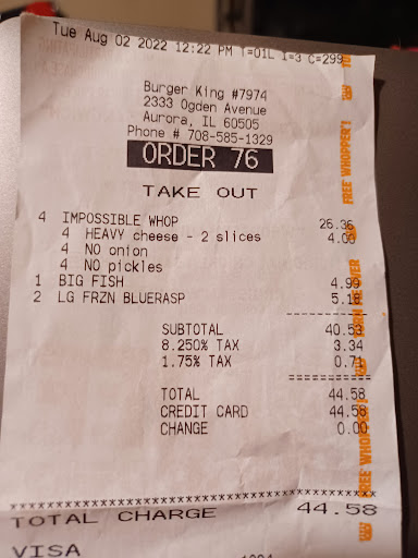 Anyhoo, I received my order and left. Oh! I asked for my receipt. I asked her if it was the "right one?" She said it was. You'll see in the photos what I was given. Incompetence. When I arrived home, after taking my mother’s food items to her and her overpriced drink, I was finally able to see the receipt. Imagine to my surprise when I saw $44.58! What the?!! Immediately I tried to call them. The number on the receipt was a fax number. I Googled it and found the correct number, yet no one answered. I called twice. I drove there the following day and spoke with the same cashier. Smh again…Here’s a short synopsis of her responses: The manager was told that he needed to change the number on the receipt and still has not. The guy working there Tuesday evening was by himself “...so that’s why he didn’t answer the phone…” You didn’t choose the right size and cup (I asked what the cup looked like and she showed me a smaller paper cup). She told me I had to order 2 different versions of the “Impossible Whoppers” that are not even advertised. I responded that’s not what’s advertised and pointed it out to her. I left without my stolen money.