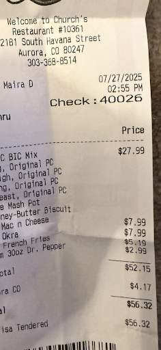 Read moreIn my personal experience.. it's just how I rate this place. Colorado Springs does not have a Church's Chicken..but I'd love to see one placed here..only to see if it would be better kept..food and customer service would be at an all time high. I know about this place because of living down south for so many years..and when you've had good food served hot all the time..fresh biscuits and great customer service....clean stores and restrooms.. you'd think it would be the same somewhere else..but unfortunately not. I travel here from time to time because my child loves to eat here and he doesn't get the chance to go here.. it's not like in the South. Every time we go..we hope to find it different..at least hit chicken or something fresh..most of the time it's only the fries that are hot..shh..the chicken is always over fried..the biscuits seemed to be setting out too long..and the customer service..let me tell you..when you walk in..they look at you.. keep doing what they are " NOT REALLY" doing and they make you wait until they're ready to take your order..then they give you one thing hot in your bag which would be the fries..by the time you open your bag.. it's too late.. then you're upset because you got treated so poorly and the food is not what it seems. But my Son likes to come because the Springs don't have one. I want to be wowed one time..I never seem to get that. Maybe I'd just stick with KFC and call Church's Chicken a quit. I'd love to see others opinions on how they were treated here.. especially if you have come from a long distance. This place could definitely use better management and employees..but I'm just one unsatisfied occasional customer. This is only MY PERSONAL EXPERIENCE.. you can make or have your own decision. Also for the price my Son paid for the 3 of us..so not worth getting food that is not up to par. We still eat it because many people all over the world are hungry or homeless. We think about this and we were raised to be grateful for everything we have so we don't throw food in the trash..we still eat and...