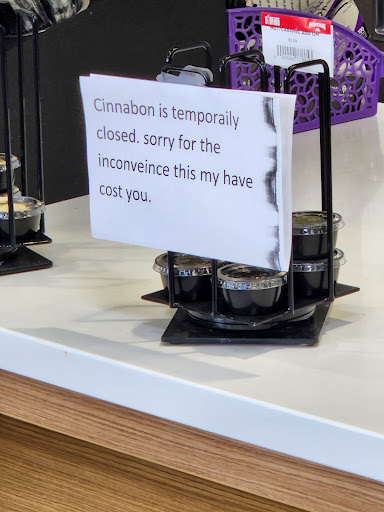 Read moreFor the past few weeks they haven't actually had Cinnabons for sale. Sunday and Monday I went in and there was a sign that said they were closed because they didn't have ingredients. Who is in charge of ordering supplies for these people? They aren't doing their job it seems.