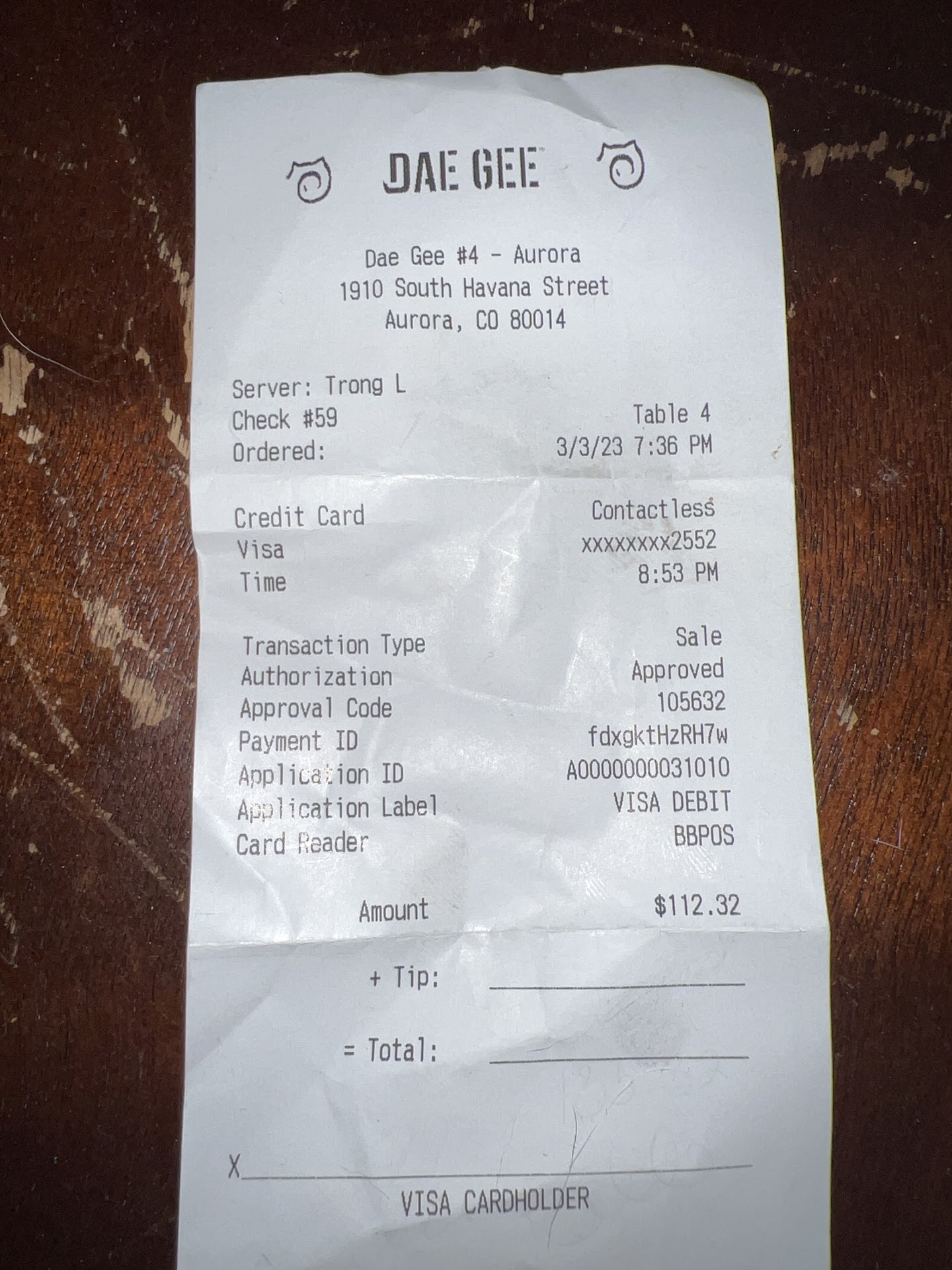 I want to preface this review by stating that I have gone to Dae Gee in Aurora on Havana for some time, and although I’ve received pushy waiters and occasionally rude servers overall it was never enough to make me say I wouldn’t return.