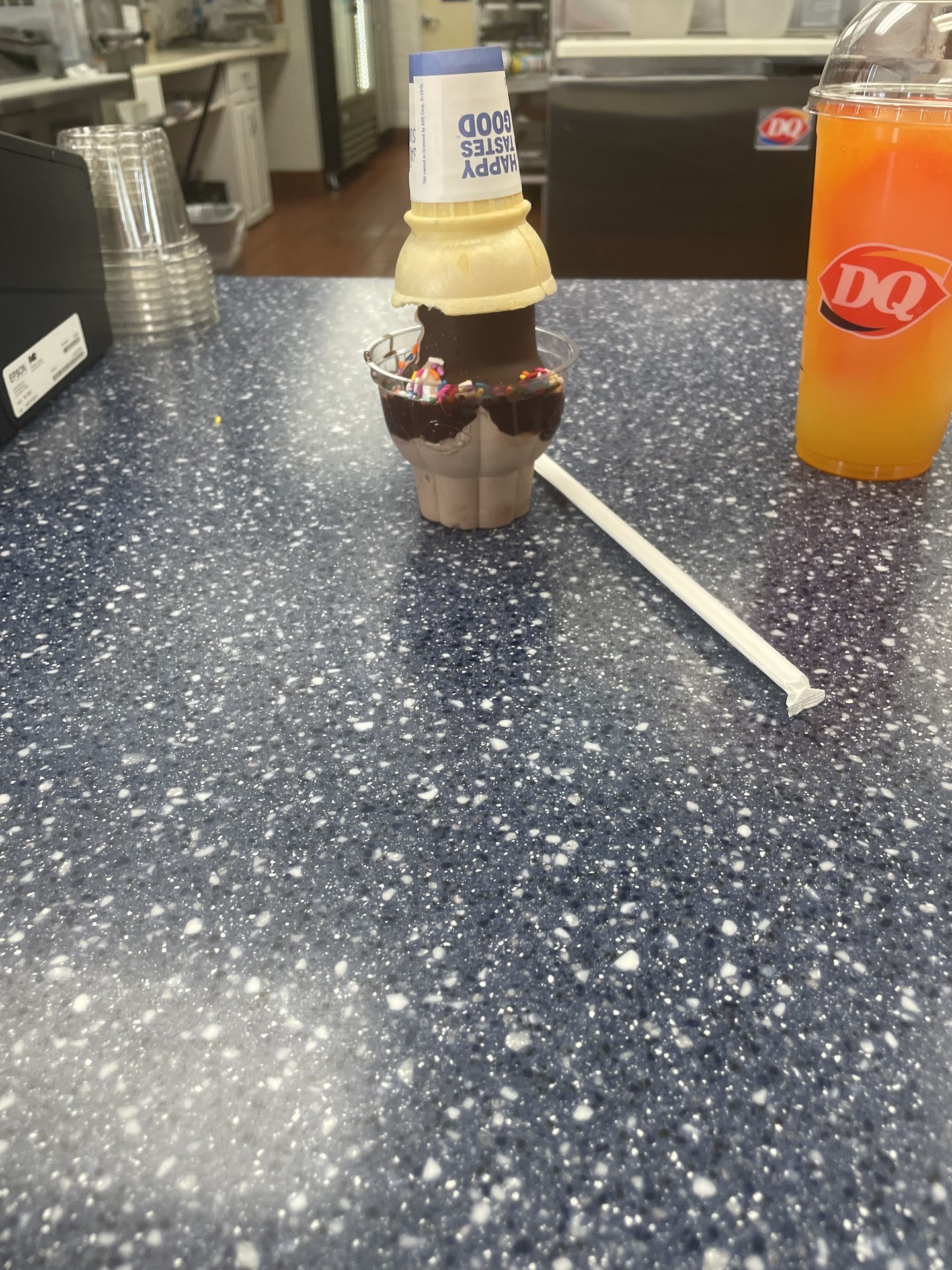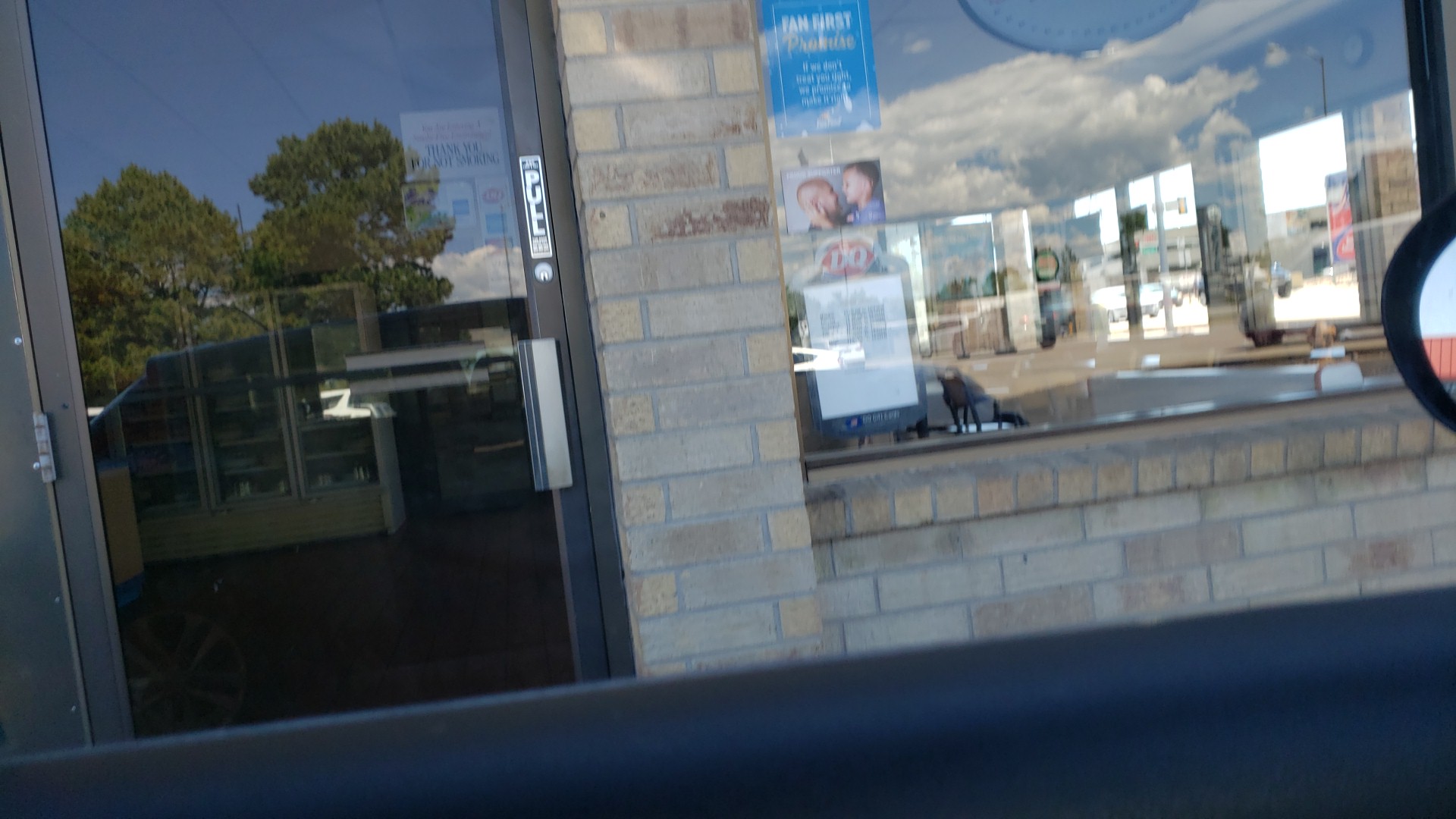My coworker ordered a dip cone, which she agreed to get after our meal. The employee was on the phone and turned away to trash a water cup as we approached the counter. Made his way back to the counter saying "I gotta go," on the phone.