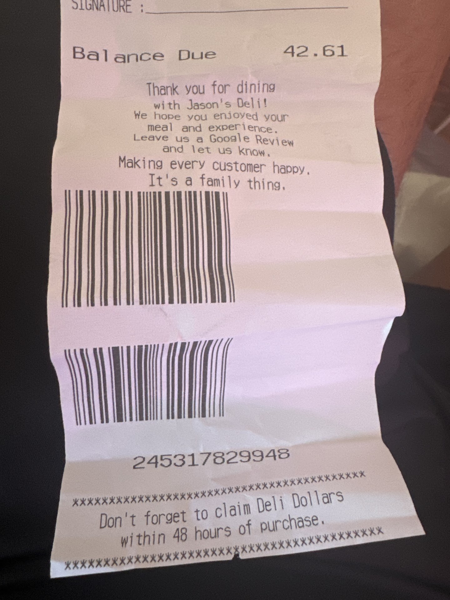 Read moreYesterday I ordered food online at Jason's Deli off of Parker. After I had ordered it, it said it would be ready in 15-20 minutes. When I got there in 20 minutes they hand't even looked at the order. I had to wait another 14 minutes for my food. So why am I giving 5 stars? I had just had a bad customer experience the weekend before at another restaurant (they charged me twice for my order) that left such a bad taste in my mouth I said I would never come back. I feel that sometimes it's best to judge a place not when things are going well, but how they handle it when things don't go well. Not only were they apologetic and accepted blame, they also reprimanded the person responsible but in an appropriate way. All of these things did not happen at the other restaurant. When I left I was still a bit annoyed but it was what it was and I think they did handle it okay. But the kicker was they called me an hour later on my phone, and talked about how the extra wait was unacceptable and that next time I was in the store I would have two free meals waiting listed under my name/phone number. That's how you handle customer service and get customers to come back. Much respect. And on top of that, the food last night...