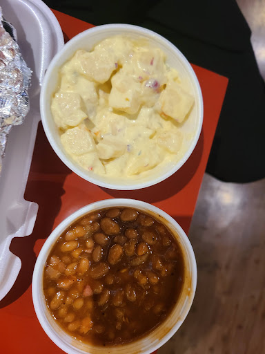 4 stars only because it was 1pm and they had NO ribs. The pulled pork sandwich was huge. There was meat on top of meat on it. NY husband got the 3 meat platter. So all side items are separate. They did not come with the sandwich or platter. We ordered Mac-n-cheese, baked beans, potato salad, & baked beans. Side items were very plain & basic to say the least. The winners here are the meats and the bbq sauces. I'd easily go back for the meats and feel good about not ordering any side items. The decor is an odd assortment of whatever they found and decided to throw on the walls. This place is really meant for carry out orders, not particularly dine in. Condiments were in packets, silverware also along with salt & pepper. Paper towels were available but at the main counter, not on the tables. No fountain drinks. Bottled drinks only. Service was good. Staff was friendly. Food came out very fast. The place is busy. For every 1 customer that leaves with an order, 2...