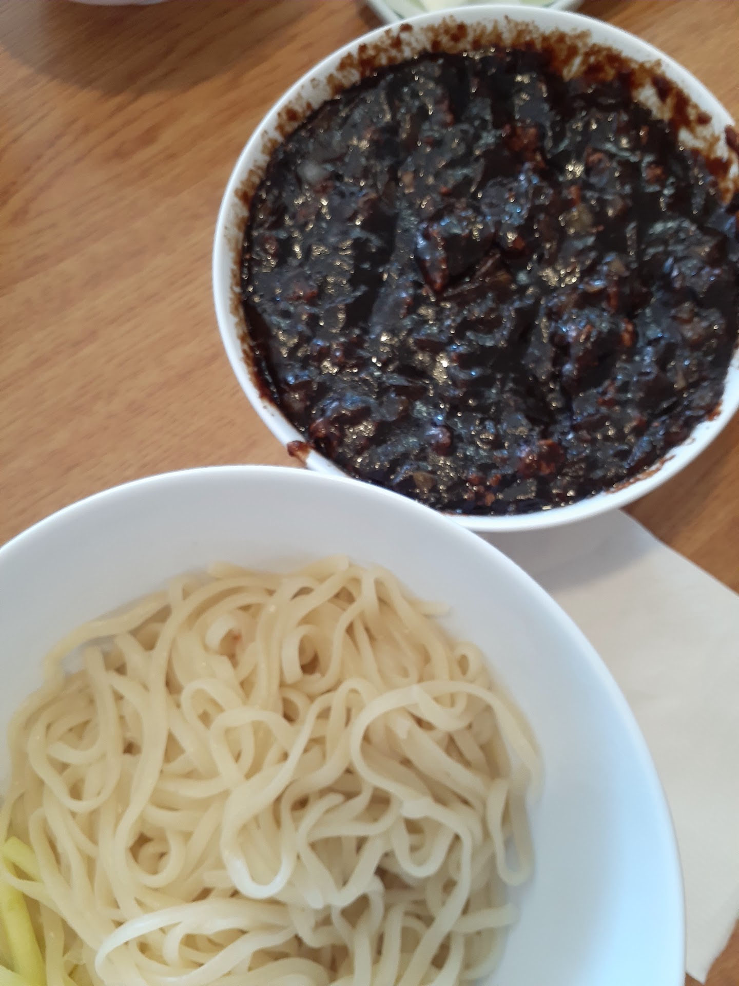 Jajang 炸酱 literally means fried sauce. So the bowl of black thick sauce is fried with ground pork. So for first timers, expect Jajangmyeon (자장면) to be oily with very thick textured sauce. I was slightly hesitant because of how dark and sticky appearance but that's exactly how it's supposed to look and feel.