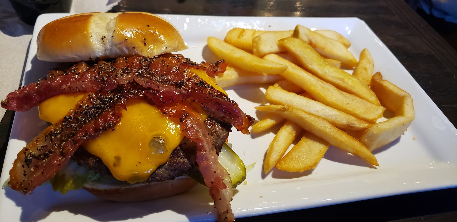Read moreI've gone to a few in my life and they always have that chain feel like olive garden... this trip however was absolutely terrible. Starts out by us choosing the bar over the main dining area. The tables were a little dirty but a waitress wiped them up quickly. Our waitress asked for our drink order and delivered my water and husbands soda in an okay amount of time but I was still waiting on a sangra. This was the last time we saw her. It took another waitress delivering my sangra to realize our waitress abandoned our table and took our order. Our visit pretty much swirled down hill from here. Our App, Pretzel bites came out hot BUT with a puddle of grease in the basket, literally like an inch deep of grease. We sent it back, waitress apologized and took it off the bill, great. They were out of Salmon for the burger I ordered and I switched to the Southern charm? I honestly couldn't tell you what it tasted like besides weak bbq sauce, this thing was swimming in it. The bacon was paper thin and both of the burgers had the slight after taste of charcoal, not the good home grilled kind either. Our fries were cold by the time the burgers came out, we also sat without food much longer then others who sat down after us. It took entirely took long for someone to say they were out of Salmon as well. So needless to say, we won't be back and seriously suggest anyone taking the time to read this to just go across the street to Freddie's. Your kitchen staff...