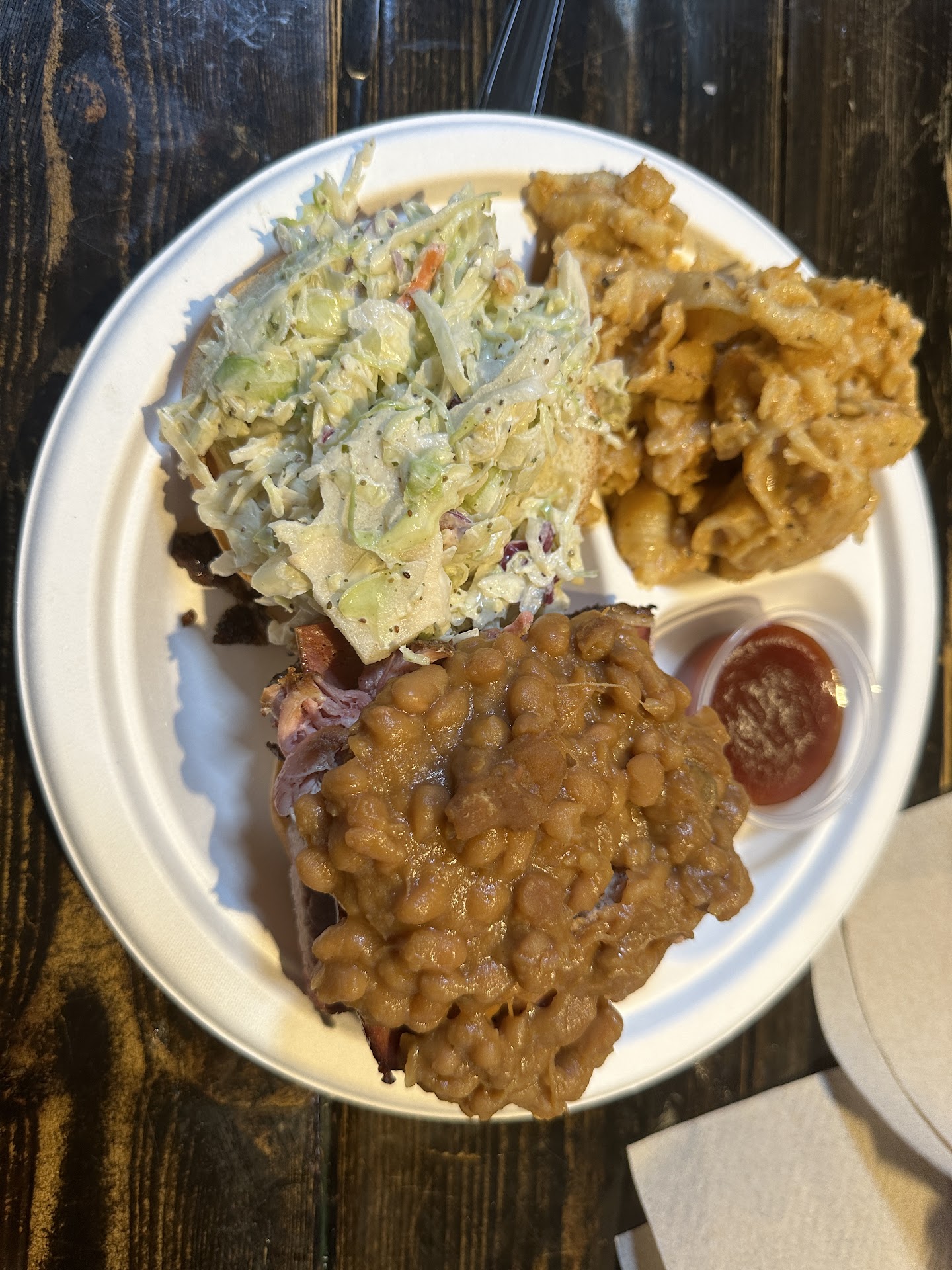 I ordered the El Jefe sandwich which was brisket, smoked sausage, pulled pork, baked beans and cole slaw on a bun with a side of macaroni and cheese.