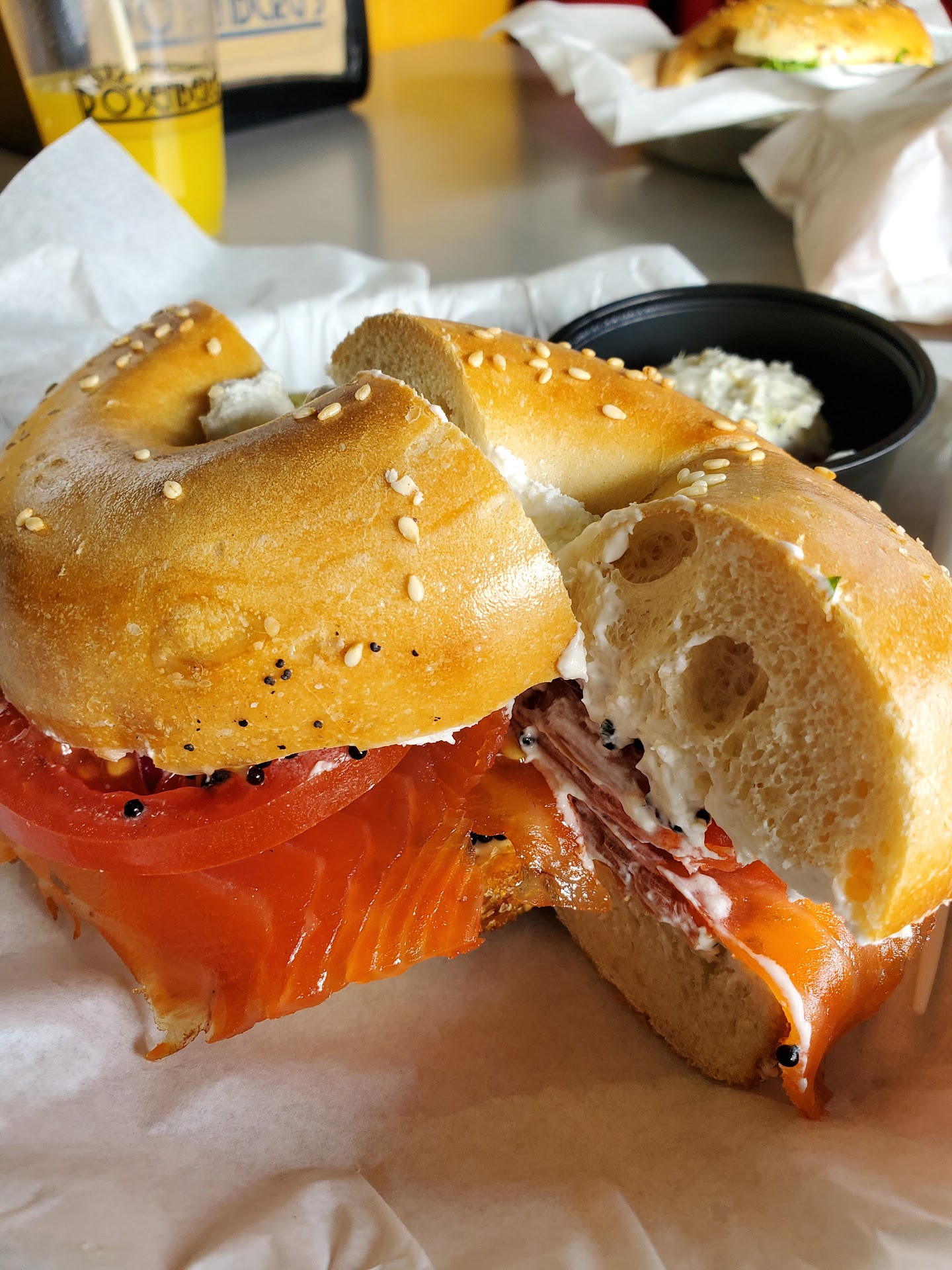 My fiancee got the High Class fish sandwich on a bagel. At first glance we could both understand why this sandwich carries the name "High Class". It was obvious when you see the caviar loaded cream cheese smeared all over the bagel and lox. We both felt that the tomato was too overpowering and that the lox themselves did not seem as fresh as we are accustomed to when enjoying such a Jewish delicatessen staple. It's because of this less than stellar sandwich and the above mentioned disappointment related to the Wings of Pastrami that this great spot earned 4 stars instead of 5. All in all, this is a good spot to swing through and grab food at while visiting Stanley Marketplace. I feel comfortable recommending this place, and hope next time around could be more of a 5 star experience.