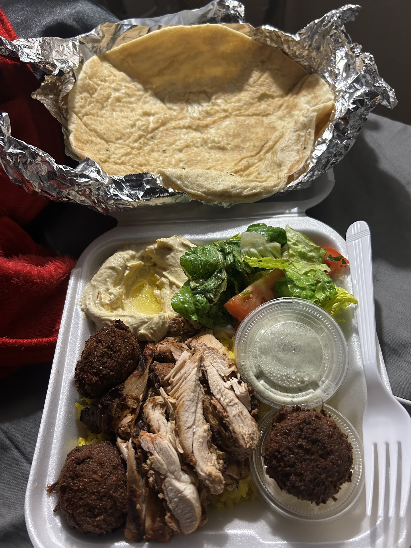 We finally get our food and leave, only to get home and realize we didnāt have pita bread like we ordered but whatever it wasnāt a huge deal. We tried the spicy potatoes and they were still starchy and very undercooked. I tried the hummus and it had no seasoning it literally was only ground chickpeas. And then the beef shawarma was black. At first I was like well maybe itās just char and flavor, blackened meat isnāt always burnt. Nope. This was fully burnt and inedible. I couldnāt even chew through it. The rice tasted three days old and was cold.