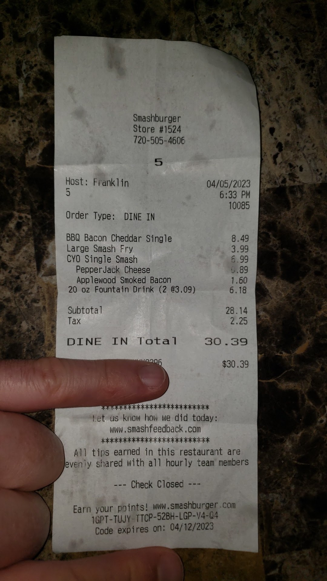 In all, the burgers were average (which is disappointing considering how much my family typically enjoys Smashburger), and the chicken strips were awful. Unfortunately, even the usually consistent fries were soggy.