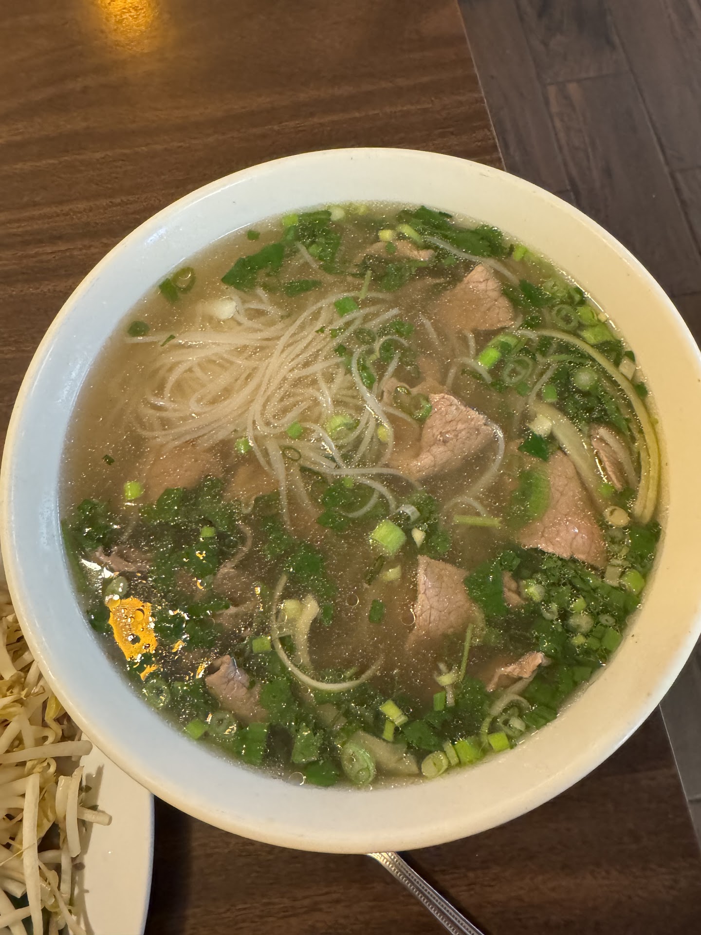 When I first walked in the lady greeted me she wasn’t very kind, but the food was good. I walked in it was empty, and I’d say I waited maybe 2-4 mins top for my food. They were fast at getting it ready I ordered steak pho and cheese wantons. They didn’t have the sweet brown sauce or their hot sauce on the table. I asked her for it and she said they just opened. She brought it out and the sweet sauce that I like was barely half full. I use a lot of this sauce when ordering pho for flavor. I wanted to order wantons and they only had a 7 piece option which I think is not very convenient. I’m just one person so they should have options for people who come in and dine alone. Then to go and charge you extra for to go containers is crazy. I’m not sure how they thought I could eat all seven wontons and not need a carry out bag but all around the food was OK and the wait was great. But the customer service I’d at least say she could’ve tried a little bit harder to be nice. All around I would return to...