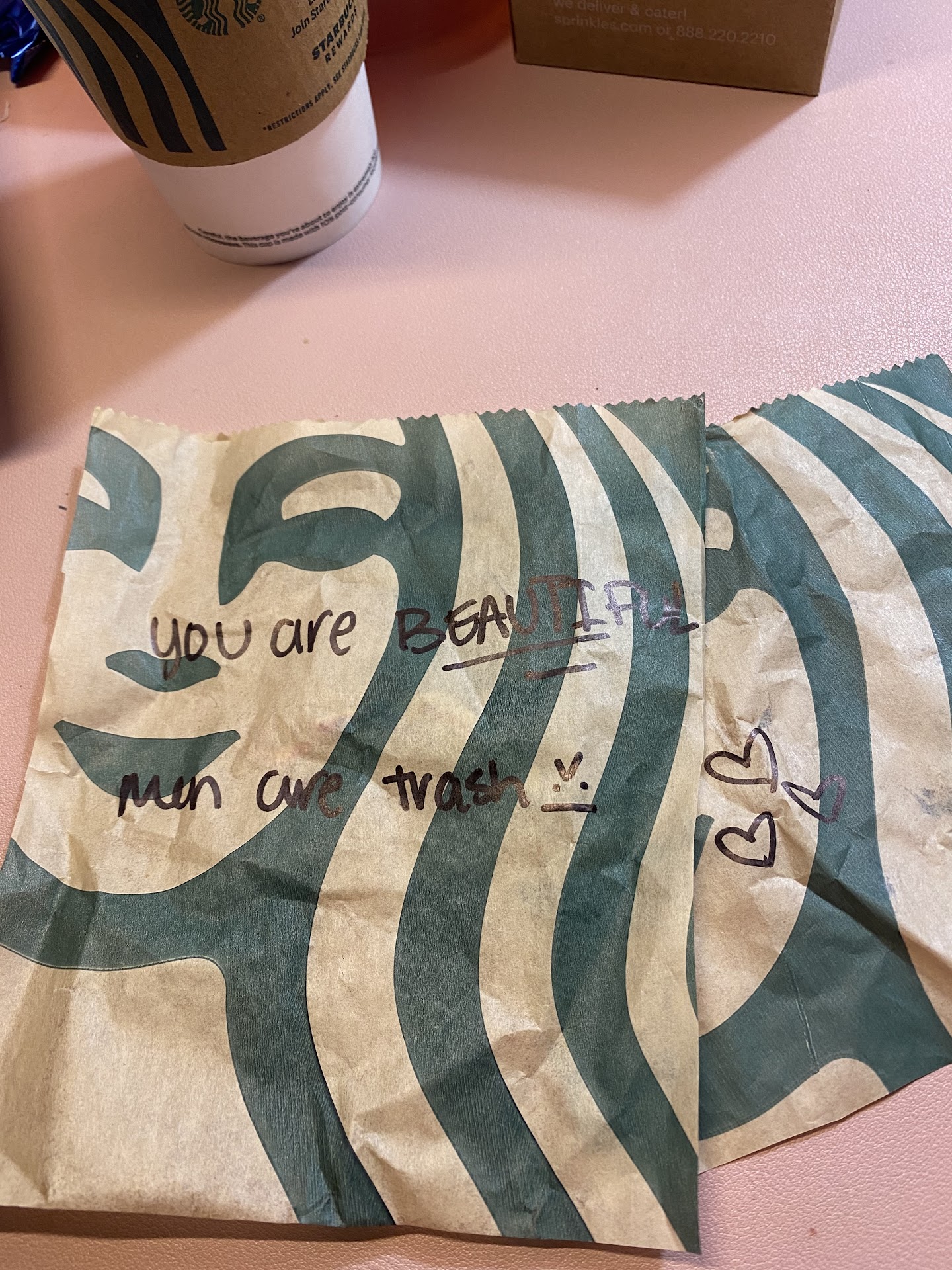 Ā Ā Ā Read more2021 has been a awful year for me so far. It's testing my resilience beyond what 2020 put me through. I was having a really bad day, and was debating Starbucks. I went and ordered the usual Honey Citrus Mint Tea and chocolate croissant. And like a loser, asked "What do you recommend after a bad day at work and dealing with a bad breakup?" Two lovely people suggested the velvet loaf bread (which was indeed very sweet and delicious). Once my order was ready, a sweet woman came to the window and reassured me and said she hopes I have a better day. I told her a little of what I've been going through, and she was so nice and kind telling me I'm a good person. I wish I asked the names of the two baristas I talked to, because they lifted my sad mood. I cried of happiness on my drive home instead of sadness, and came home to find kind notes written on each item I got. This Starbucks is so much better than the one on US-34 by Douglas. Thank you for taking the extra minute to make me, a complete stranger, feel comforted and reassured. This is the nicest thing someone has done for me in a long time. You are beautiful souls and I hope you are feeling...