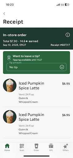 I told her that I always get the hot latte at another starbucks without any question, so thenn I wait for like 5 min. Then I get my drinks and they are double cupped with no whipcream, no oatmilk and the coffee tastes oddly like bacon.