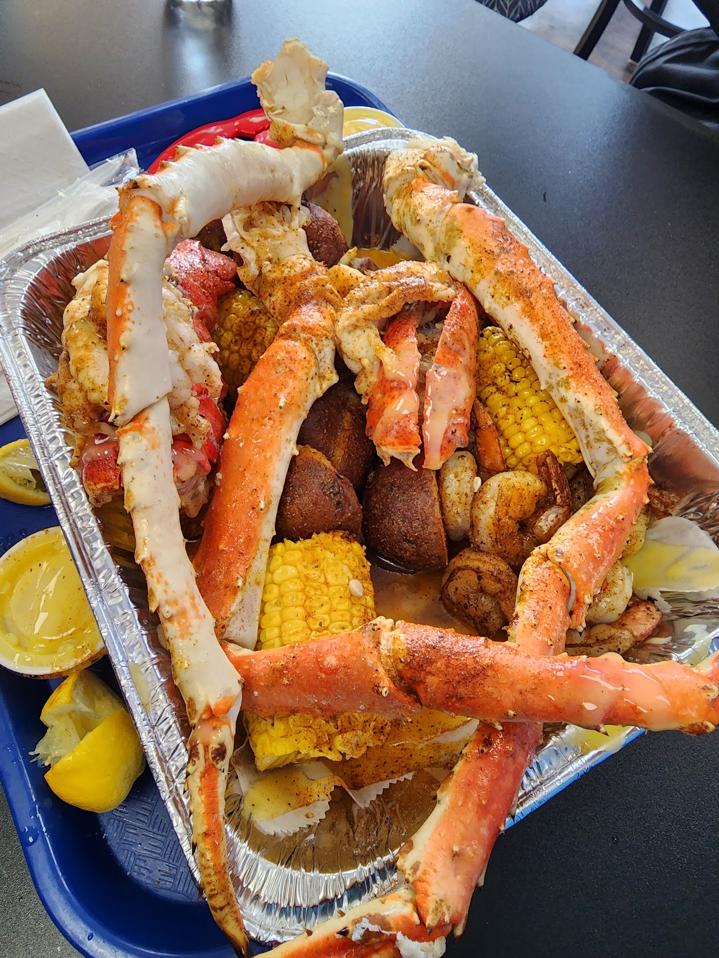 Read moreLet me start off by saying seafood here has a great seasoning and good flavor. I got what is called the "Tidal Wave" bit on the pricey side for me but I get it. $106 got be 2lbs of king crab legs, two 6ounce lobster tails, 1/2lb of grilled shrimp and prefectly seasoned corn and potatoes. I am not sure if the butter sauce they give you is real butter, didn't taste like it but it was ok.