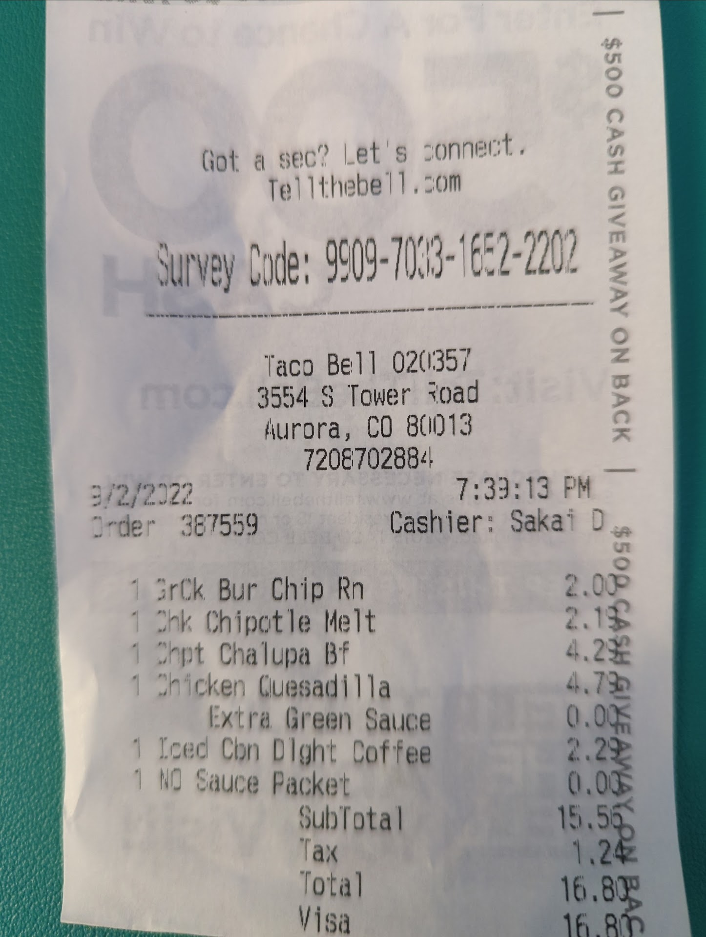 Read more9/2/22, 7pm. Honestly, one of the worst fast-food experiences ever. I know, it's fast food, expectations should be low but this was remarkably bad. Took over 45 minutes to get food and I was 3rd from the order board. I was stuck as someone pulled up behind me or I would have left. Not an exaggeration, over 45 minutes for like 5 cars. Order taker was nice but kept saying "I don't know if we have that" and apparently couldn't find out or even ask someone. at the window, 45+ minutes later I watched a customer bring a bag of food up to the front counter, trade it for a different bag with an employee and then that bag was given to me. When I asked if that customer had this bag she said "no, it was just on the counter". meanwhile all the other drive through bags are being prepped right by the window, not the counter. I accepted the bag, looked and saw a quesadilla and the right number of items and left. Got home and literally the only correct item was a chicken quesadilla. Had 3 other items that I didn't order at all. Also asked for "no sauce", it's on the receipt even, but the bag came with approximately 30 fire sauces... and zero napkins. The whole time waiting at the window there was one employee standing at window doing nothing and one employee dancing, doing nothing. No one even commented on taking 45 minutes, no apology, no urgency. I tried calling on speaker for 30 minutes while I ate random items that weren't half as good as the items I ordered, it just rings and disconnects. It's taco bell, my standards are low, but man was this...