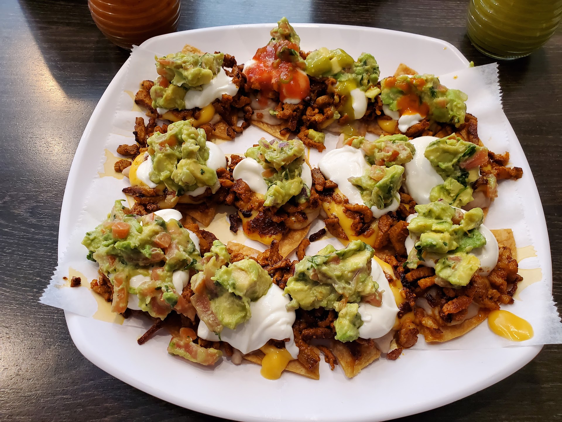 Terrible system - don't think I will be getting take out from this place again. Auténtico Mexican chain restaurant (yes, that's possible, and awesome) serving tacos, tortas, elotes, orange salsa (A+!), breakfast, seafood, soups, fajitas, margaritas, and Mexican nachos which might be my new favorite thing ever. Fresh chips and fantastic, chunky guacamole. Al Pastor was great.
