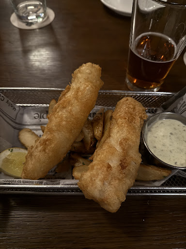 For a starter, we had the vindaloo wings. They were delicious but to be called vindaloo they really needed a little spice. They had a spice level of 0 out of 5. Overall the menu selection was great! We have visited the UK several times, and the menu felt very reminiscent of a British pub menu. We especially appreciated the menu options: mushy peas, chicken tikka masala, sticky toffee pudding and a chocolate orange flavored dessert! We both went with fish and chips. It was a lovely portion size and the chips were amazing! The fish was slightly overcooked so it was a bit dry and not super juicy. Iād love to have had a side of malt vinegar for dousing my fish and chips. We loved the mushy peas!