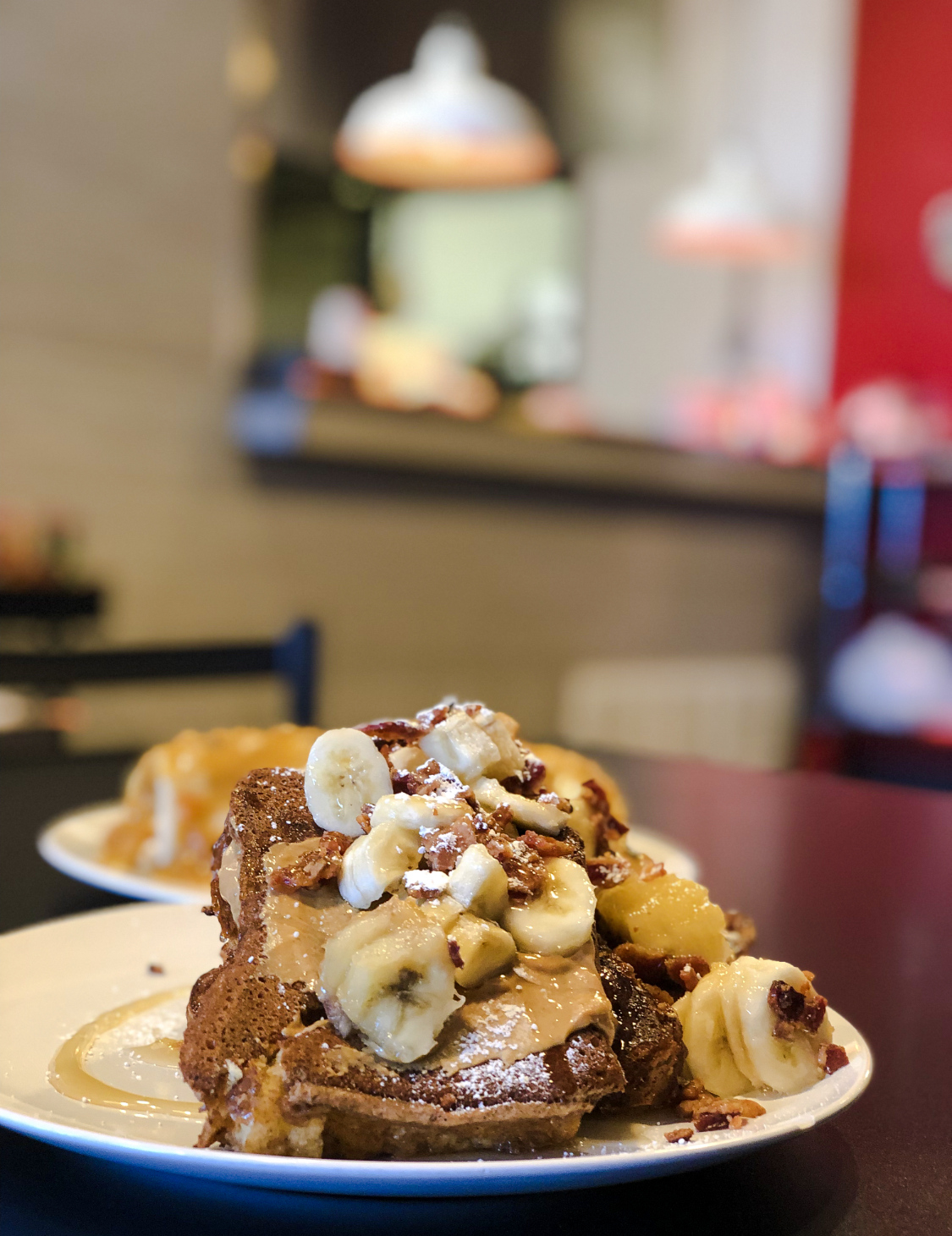 The food came out within 5 or so minutes of our cinnamon roll. We ordered the Breakfast Burrito with Scrambled Eggs, Potatoes, Cheese & Sausage smothered with pork green chili which was so good. The pork green chili was on point for sure. We also ordered the Elvis Toast. This classic toast smothered in peanut butter & topped with bacon & banana & drizzled with honey is like the perfect breakfast choice for the person who can’t decide between sweet and salty.