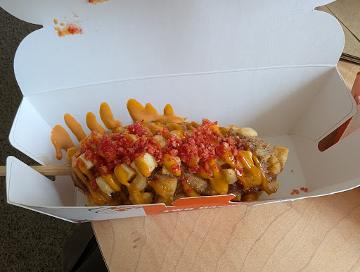 I am OBSESSED with the #2 spicy corn dog with the spicy beef sausage filling, and the kimchi fries - DO NOT - sleep on the kimchi fries! They are so crispy fresh and the perfect amount of flavor.
