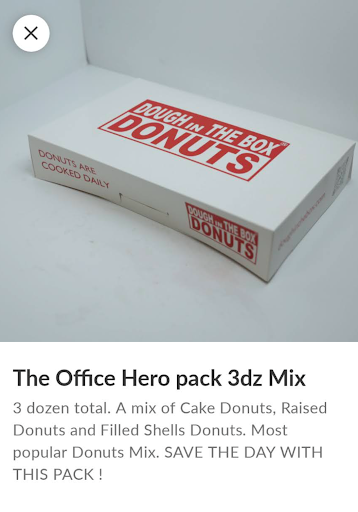 The donuts I received were excellent, but where I have the issue is that in the app, the "Office Hero Pack" of 3 dozen says it includes "A mix of Cake Donuts, Raised Donuts and Filled Shells Donuts." What I ended up receiving was simply cake and raised donuts. Again, they were delicious, but when you order expecting one thing and don't get what you ordered, it is a let down.