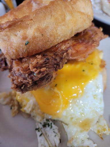 Read moreEverything was good..my fiancé and I had the shrimp and grits (grits topped with sautéed shrimp, chopped onions, green peppers, beef sausage , grated parmesan cheese and alfredo sauce). Came with a side of toast of your choice (white, wheat, or rye). I choose wheat. I also ordered a side of their hashbrown casserole and their honey chicken biscuit. ( biscuit w/ fried egg with cheese, fried chicken, and honey drizzled on inside of the biscuit). My fiancé had the breakfast platter, which consisted of 2 pancakes (from choice of pancakes, French toast, or waffles) bacon (or other choices of meat) and 2 fried eggs (or how you want it) and a side of the hash brown casserole. I also got a slice of red velvet cake to go. So, the shrimp and grits. It was good. The grits were creamy, and the shrimp was seasoned nicely. The veggies had a good sauté to them. But I could barely taste the beef sausage.It was just different, not in a bad way, though. I guess because I never had shrimp and grits with alfredo sauce and grated parmesan cheese. So it kind of threw me off. The hashbrown casserole was decent. It might have been better if it wasn't for the fact that it was cold. The cheese on top was barely melted, and I guessed it had a very slight melt on top because of the heat lamp it possibly was put under before being served to our table. The honey chicken biscuit was good. The chicken meat lacked seasoning and also in the breading, but the meat was tender. The egg was cooked nicely, and the biscuit was DELICIOUS. My fiancé enjoyed his breakfast platter. He said his egg was cooked right (fried over well), and he liked the beef sausage and his pancakes( I tried his sausage, tasted exactly like hillshire farms beef smoked sausage links, so it was ok to me and I tried a bite of his pancake, it was fluffy an DELICIOUS).. he least liked the hashbrown casserole because his was cold as well, and it had a sweetness to it that threw him off since he's used to a savory hashbrown casserole as am I. I would have given them 5 stars if it wasn't for the cold hashbrowns, the lack of flavor in the sausage in my shrimp and grits and seasoning on the chicken (side note, I did take the chicken off the biscuit, so I can taste the chicken on its own). Our server was friendly, and the atmosphere was good. All in all, we would definitely go back to try their lunch and/or their soul food ( soul food only sold on Sundays). Oh, the red velvet cake I rate a,...